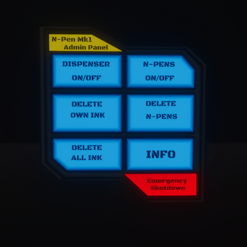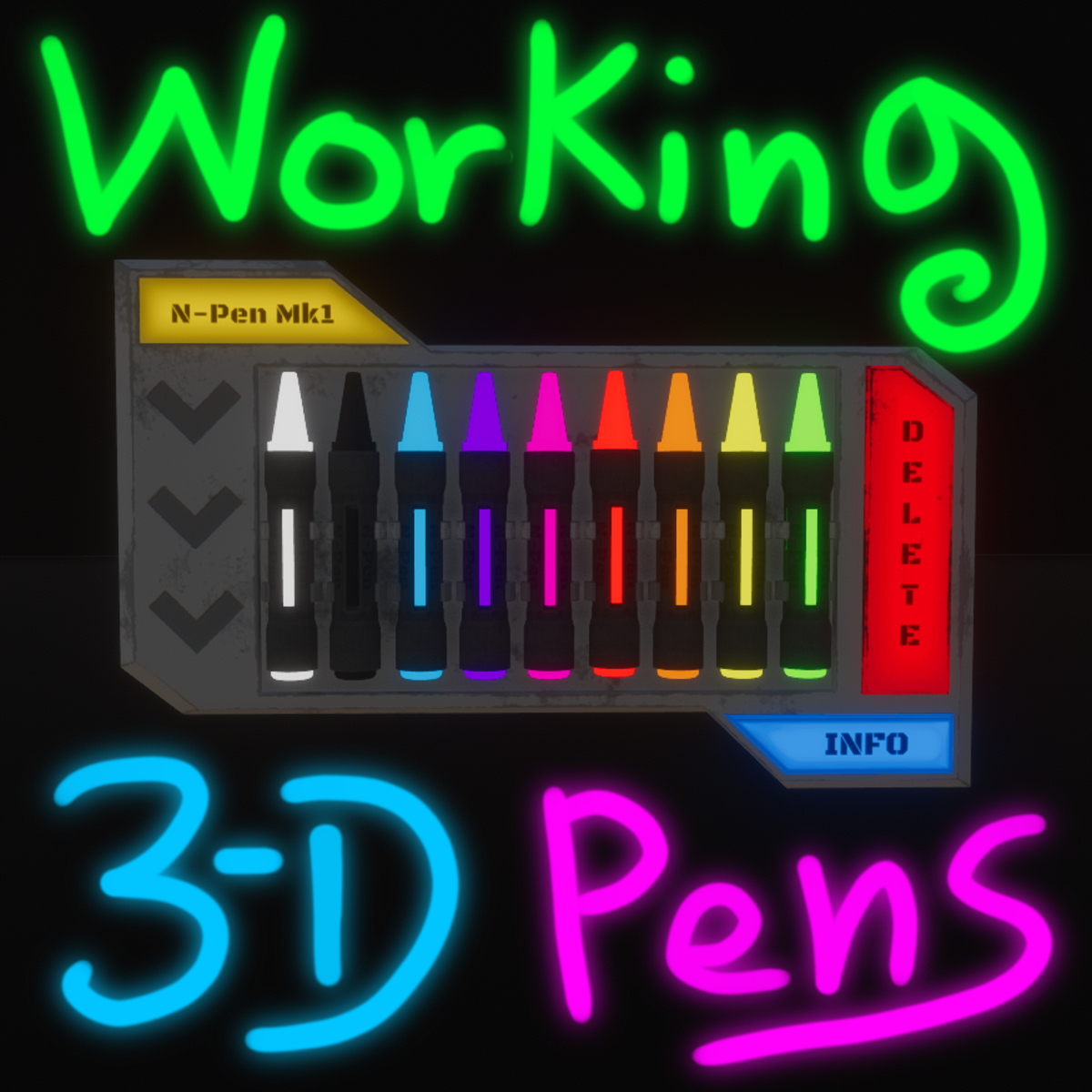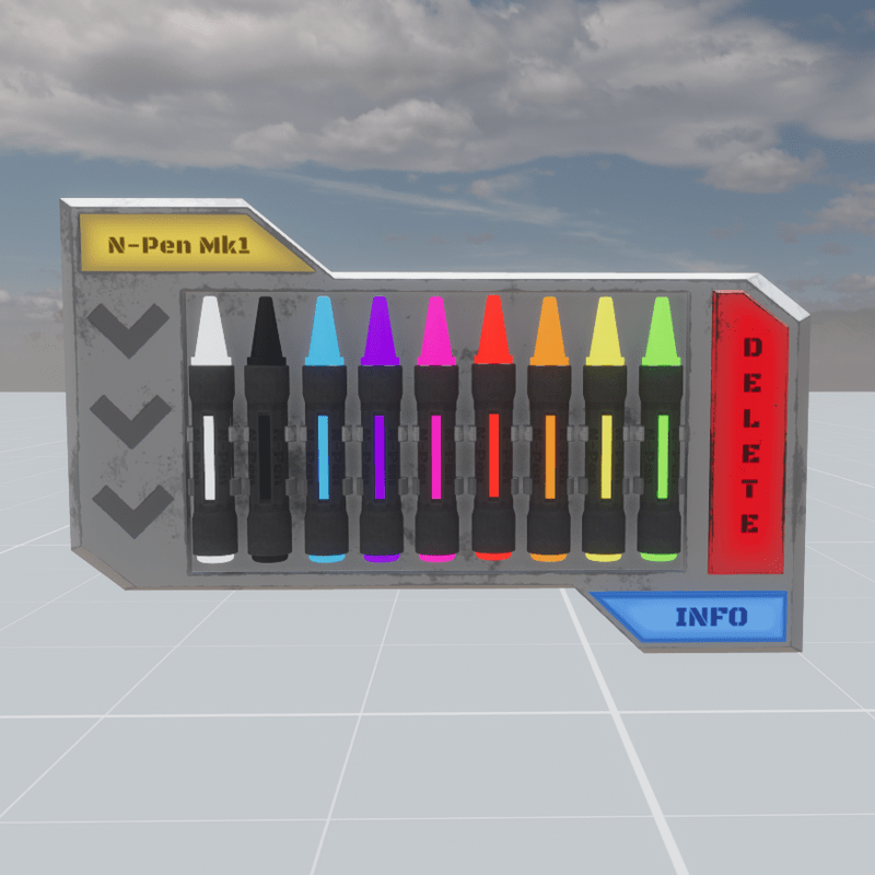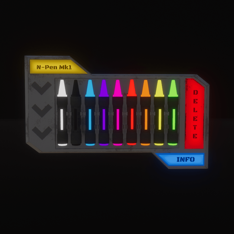 Comes in two separate versions, the first version is a dispenser you can setup on a wall, which allows multiple users to use multiple pens at the same time. The amount of pens spawned can be set on the dispenser script if you require larger or smaller limits. (default to 4 of each colour) The second version is a single set of coloured pens that users will need to share as no more can be spawned live in world. Single Set Listing: https://store.sansar.com/listings/1a6dd4b7-272d-45d3-bfb1-65977463e276/npens-mk11-single-set-and-a-panel This is the Dispenser Version of the N-Pens Mk1 Actual working 3D pens, yes you can actually draw with these in world! even on desktop (with limitation but very doable) WARNING! the pens have the ability to temporarily create many draws that increases per person in use of pens, some safeguards are included to aid in keeping the count down, these can be made to be more or less aggressive in the admin hub script settings. -Timed auto delete ink -Settable ink level per person <- this is the main option to consider -spawn rate of ink (Default is a mid setting for use in optimized worlds) --DO NOT DUPLICATE THE ADMIN PANEL-- Only (one)1 admin panel per world, you can duplicate the dispenser if needed in more locations, the script in this panel has the limit controls for the pens to help with draw counts. The included admin panel is meant to be placed in a secure location for example a DJ booth or known secret area where everything can be turned off and pens disabled if needed (there is a owner only option on enable/disable/delete all ink but the world owner must be present if selected in the script to use) Pressing the emergency shutdown will stop the dispenser, delete all pens and clear all ink until pressed again to re-enable usage of pens. If something goes really wrong hitting this will stop everything Example Gifs: https://gyazo.com/dd738b852b2aeb304b19f9db0fc1428c https://gyazo.com/1cb9919d244e683afec07256b194df74 Try out a free demo of the pens in action at this world: https://atlas.sansar.com/experiences/thenick-1981/n-pens-a-world-of-light-and-colour