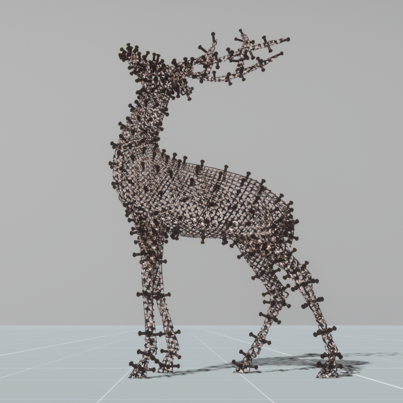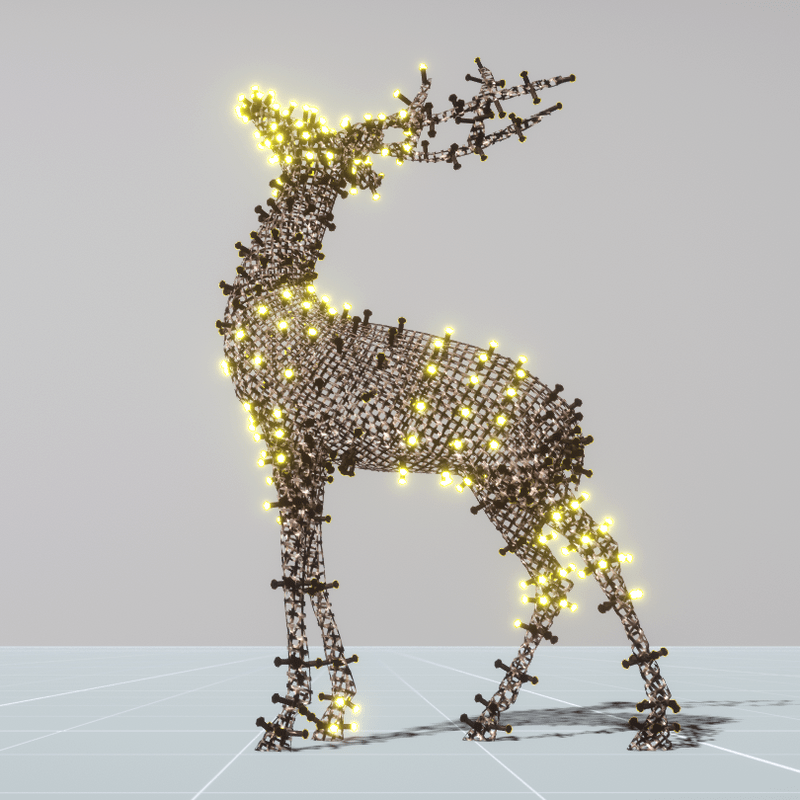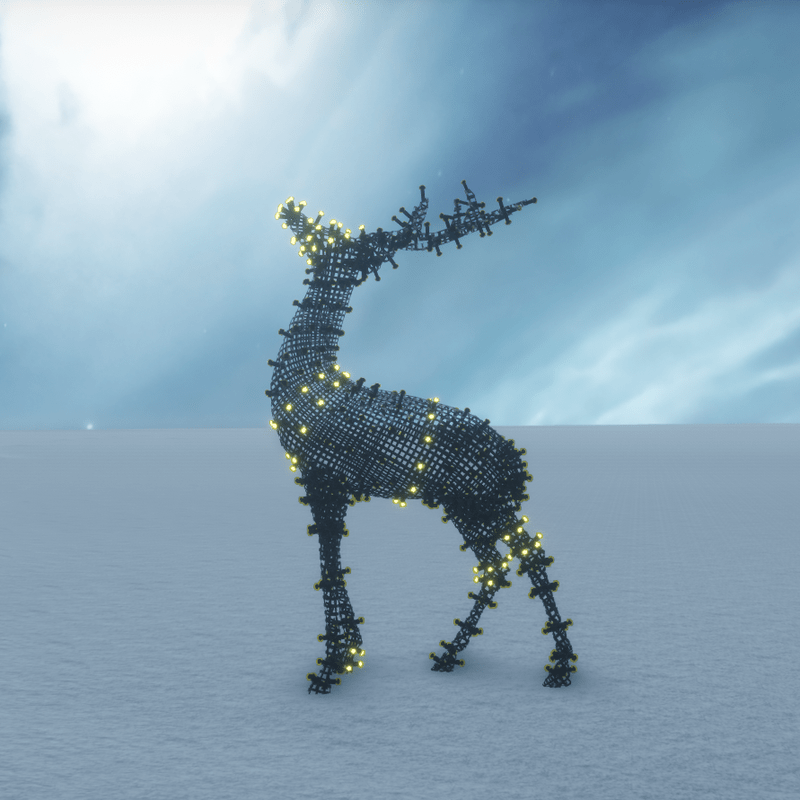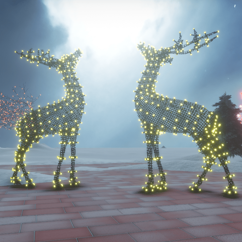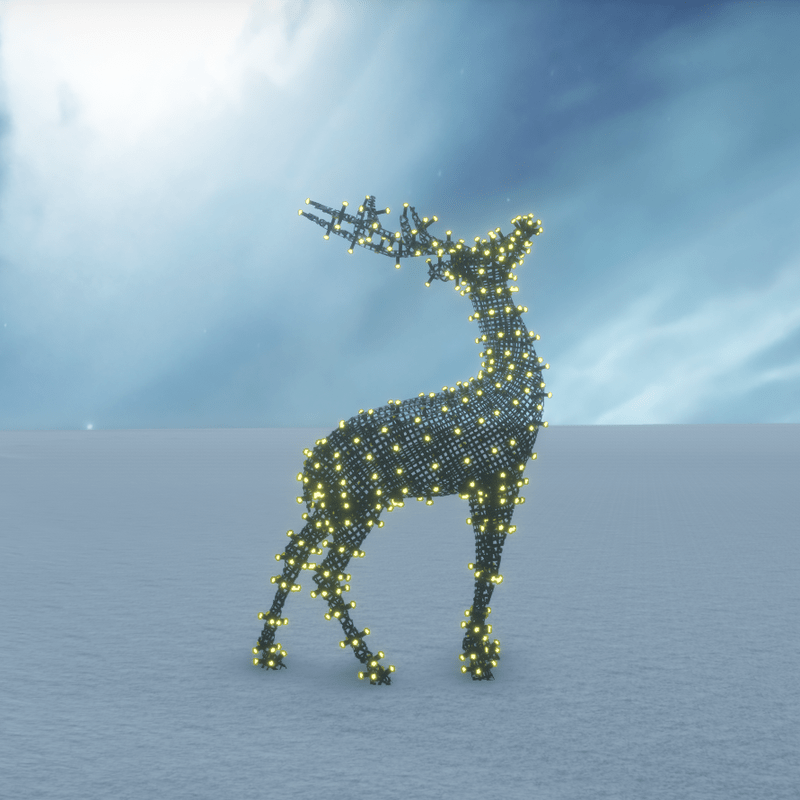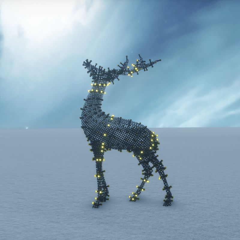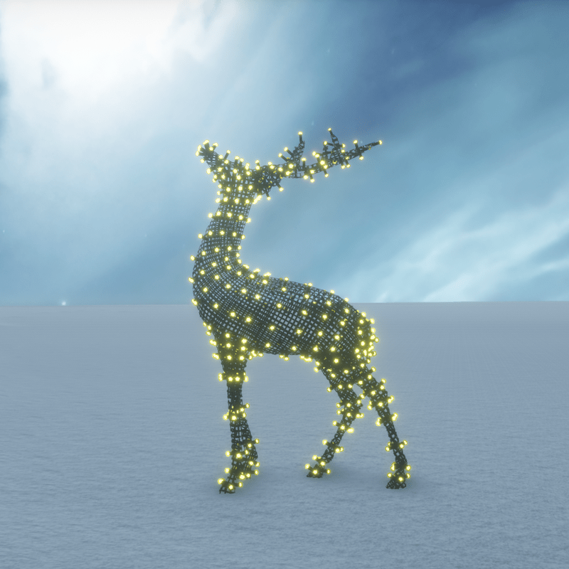 A very cute Christmas deer decorated with running lights. Suitable for outdoor (garden, yard, deck, patio etc) and indoor (if you decrease the size) decorations. No collision. You can take a look here: https://atlas.sansar.com/experiences/luise/terra-di-luci