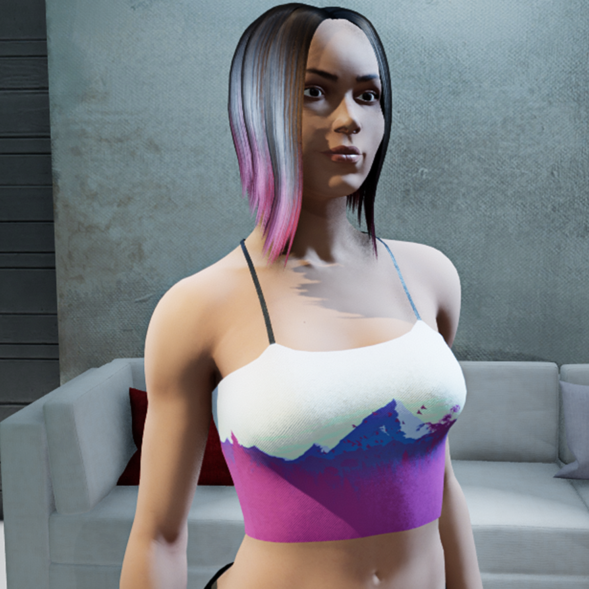 High quality textured short top with mountain print. Please don´t forget the ratings ;) You can simulate the clothes before wearing it to adjust it optimally.