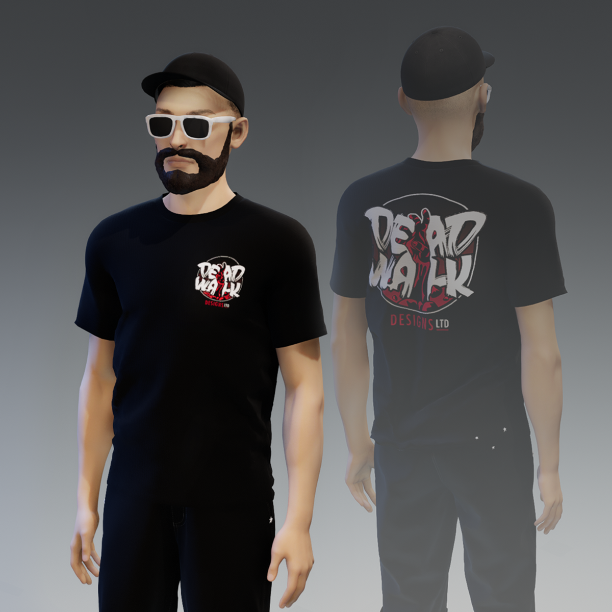 BLACK DWD T-SHIRT BY Dead Walk Designs (UNISEX) Look for this shirt in the 'male' menu. Fits both body types with the (>) Simulate button. With 'LOST HORIZON' logo backprint.