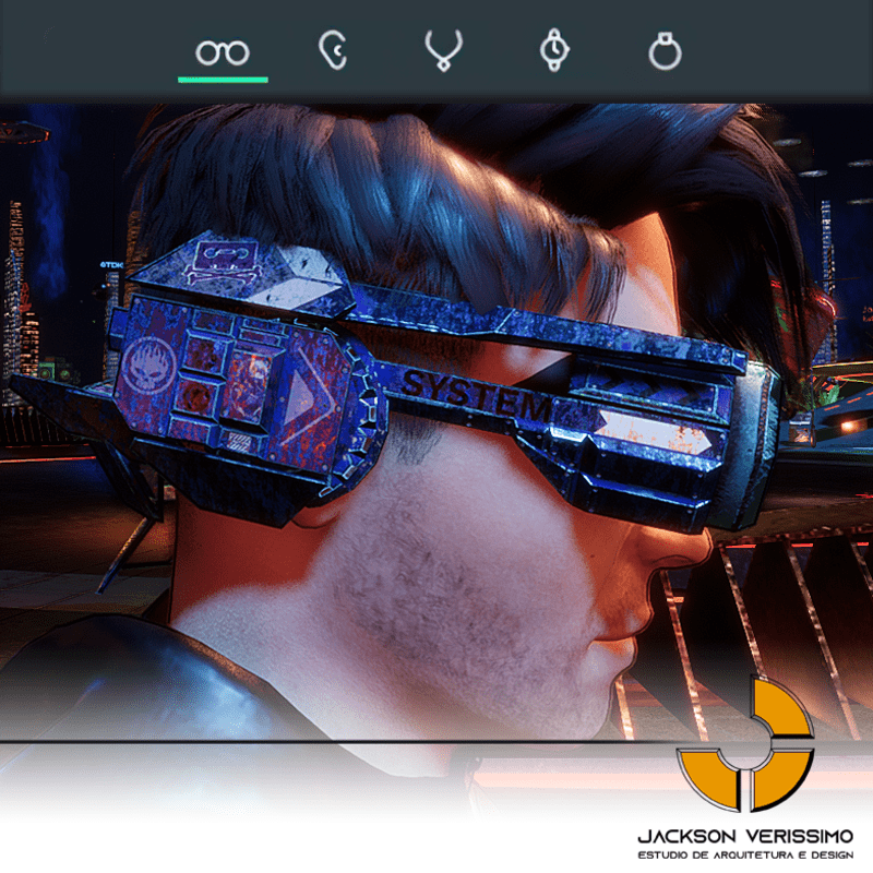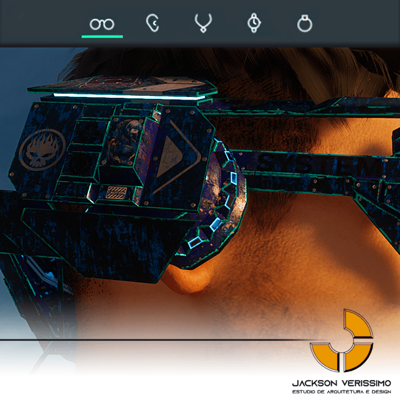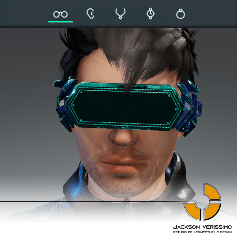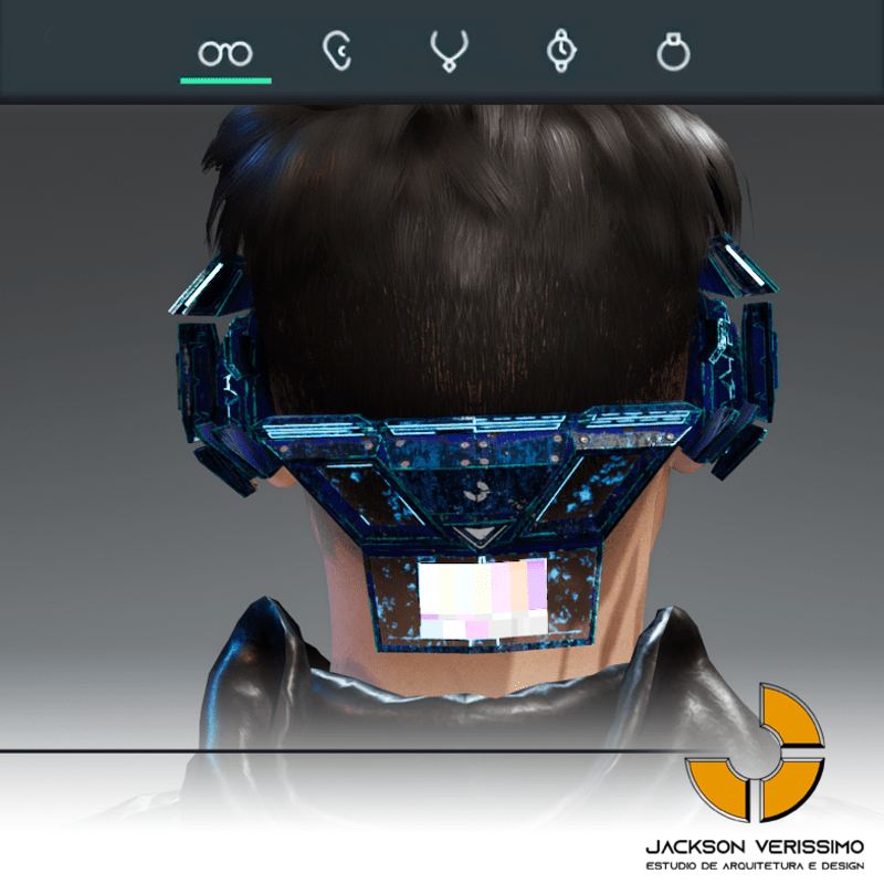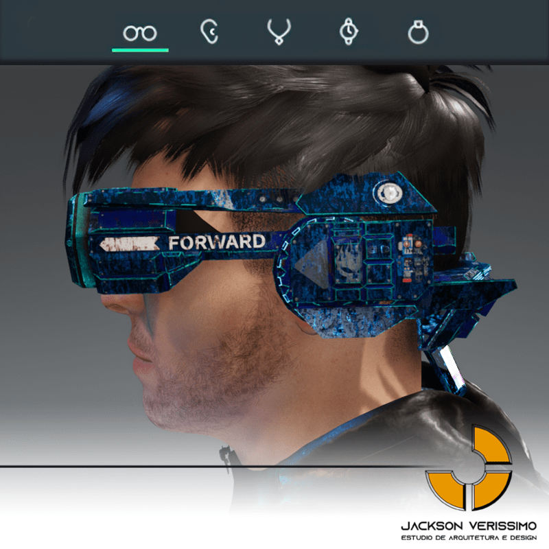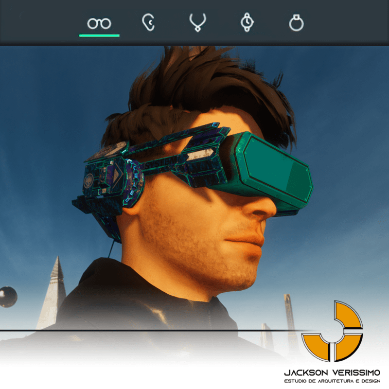 Visionary Design for a VR Headset exclusive for the Sansar Metaverse. Special and High Quality Texture. Vr glasses with headphones, Emissive lights and Media Screen. Unisex. Matches with all humanoid avatars. No need for adjustments for the default 2.0 Avatar of Sansar.