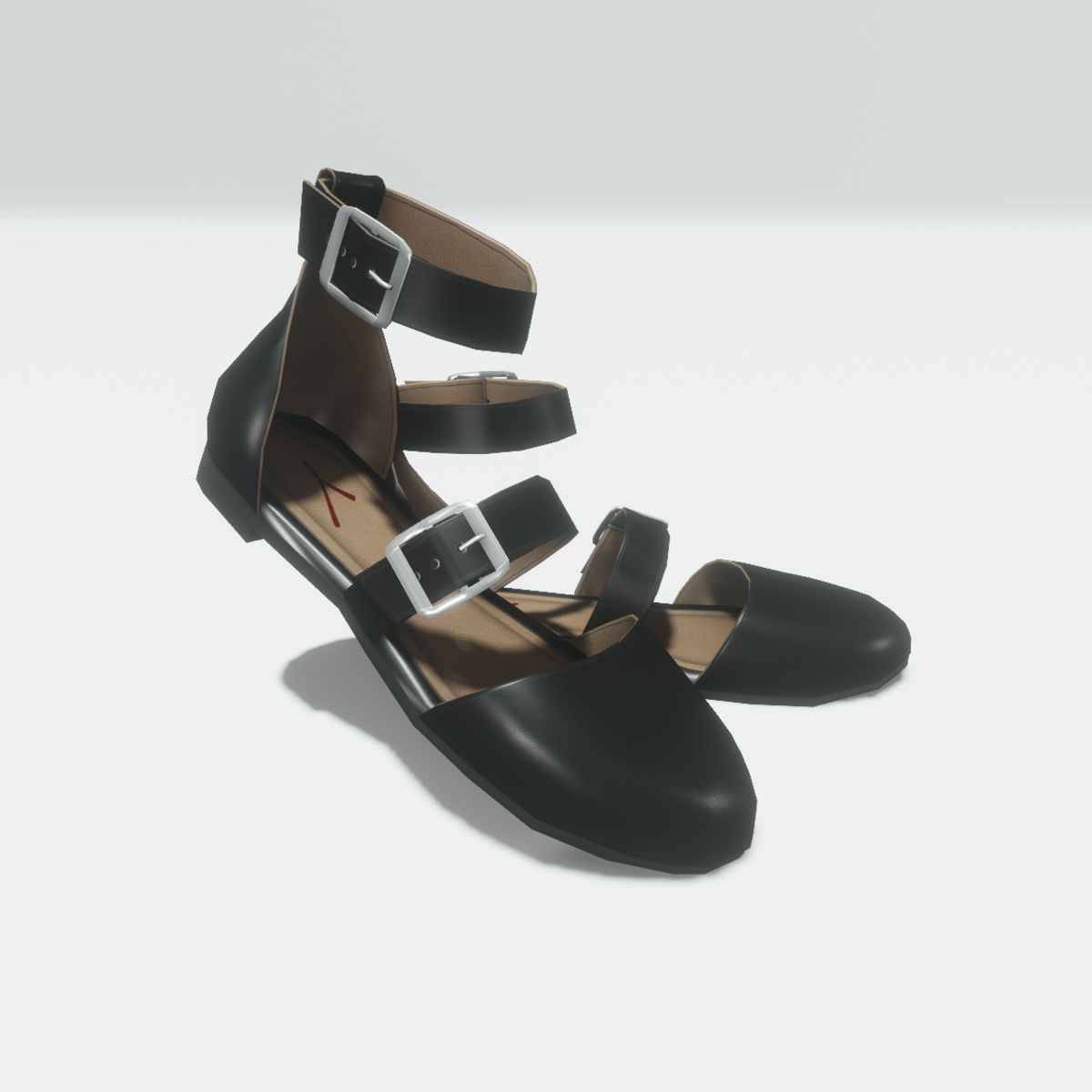 Flat woman's shoes with black leather outside and light brown leather lining inside. The toe is almond shaped. The shoe have two metallic buckle closures, one on the foot and one on the ankle strap. Before purchasing get the free demo item to check the fit here: https://store.sansar.com/listings/0ddf0fb3-e806-4914-936b-19c1b9e47cda/ankle-buckle-flat-shoes---demo