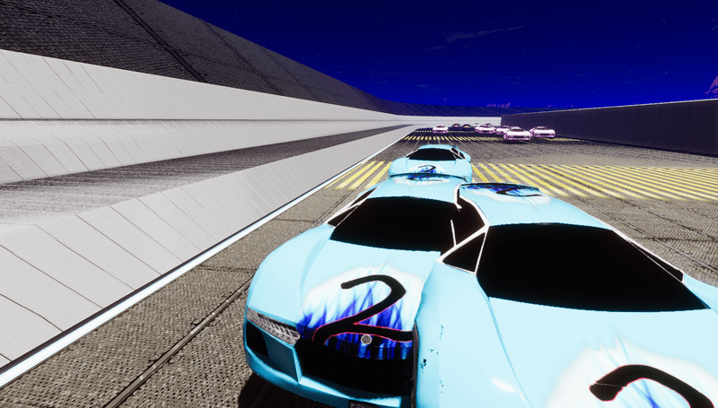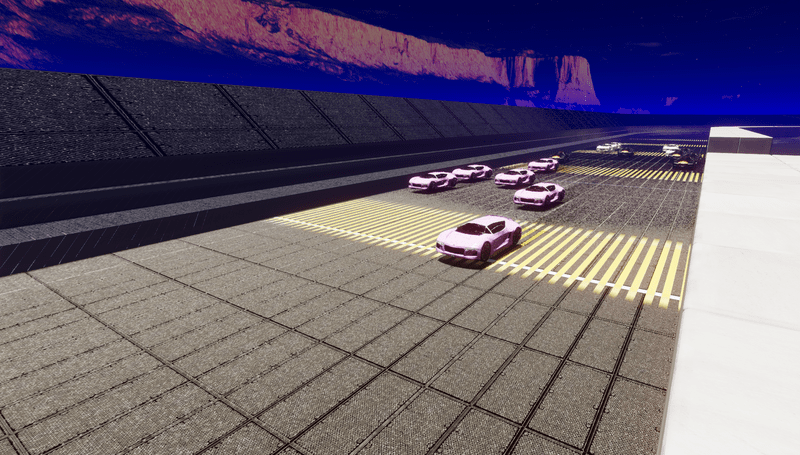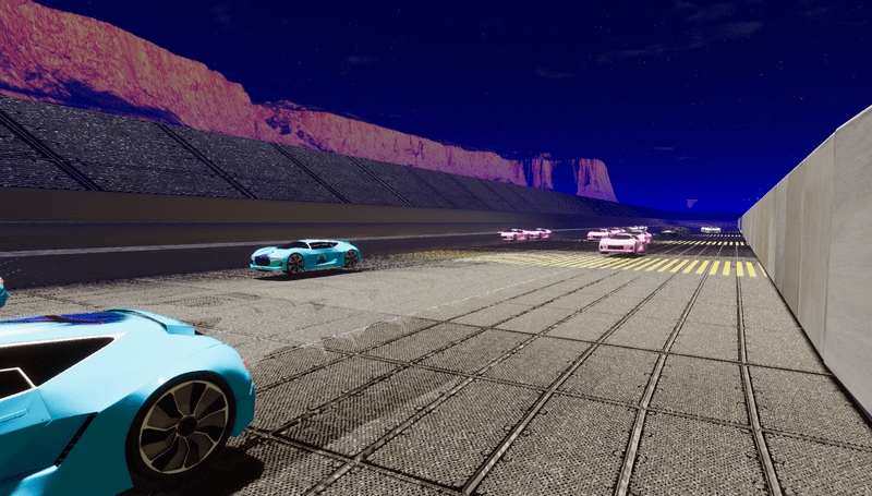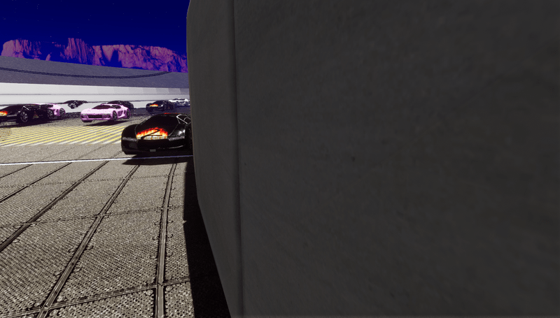 Huge track, at least a mile. Track Bleachers and concrete inner wall are three separate pieces. Cars not included. See track at experience "Racetrack"