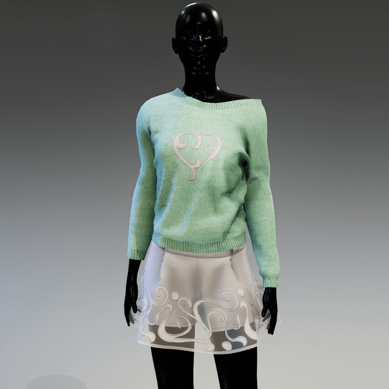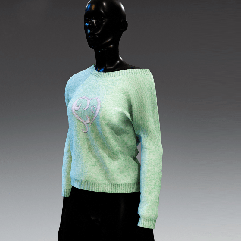 Cute, comfortable and versatile, long sleeve knit top that can be worn to reveal the shoulder. In light green colour with a white applique heart on the front. It matches the "Sweetheart skirt"