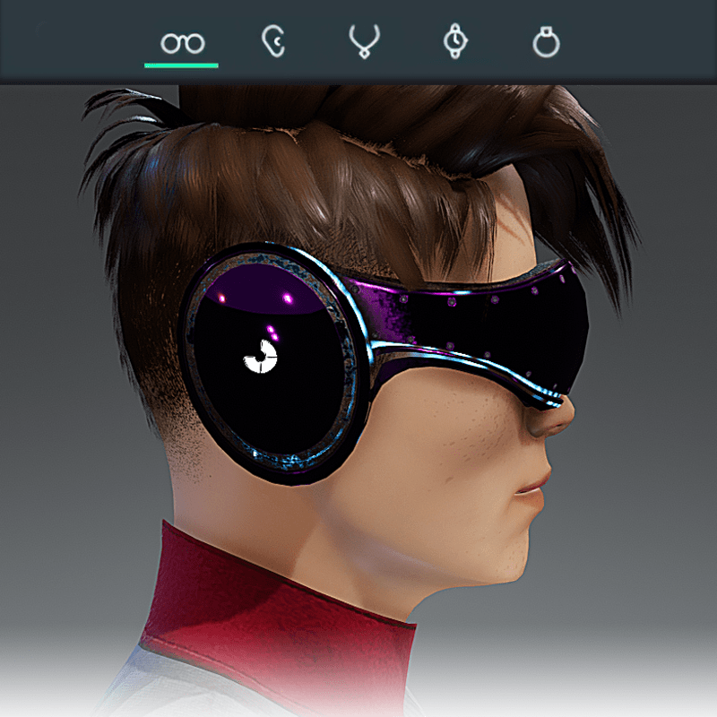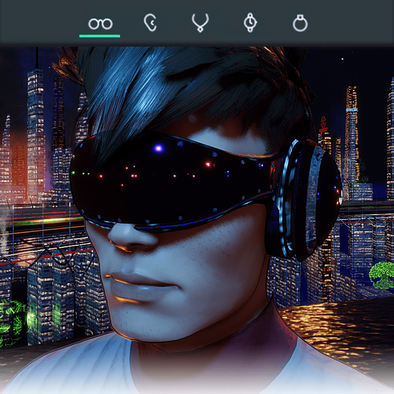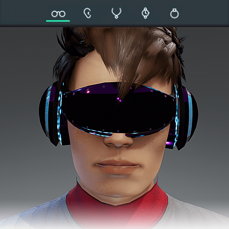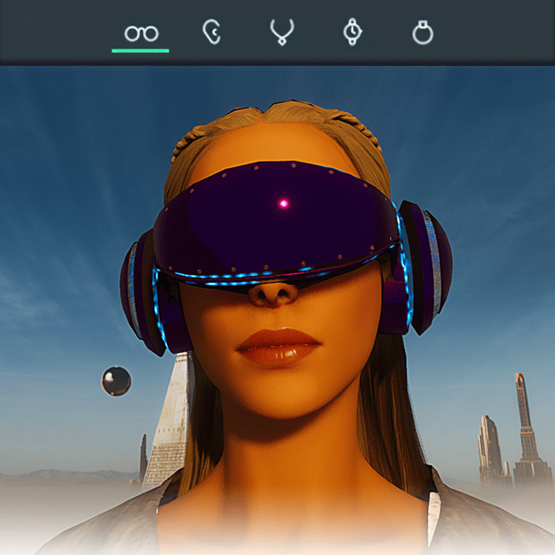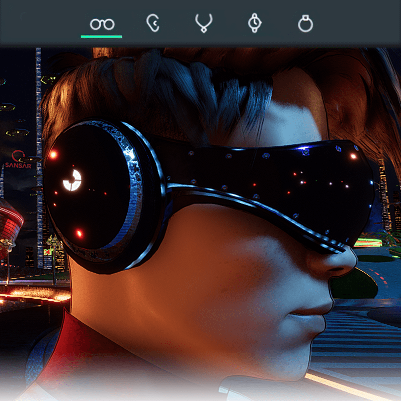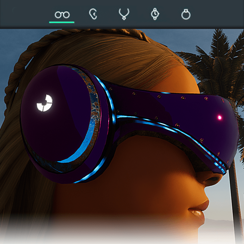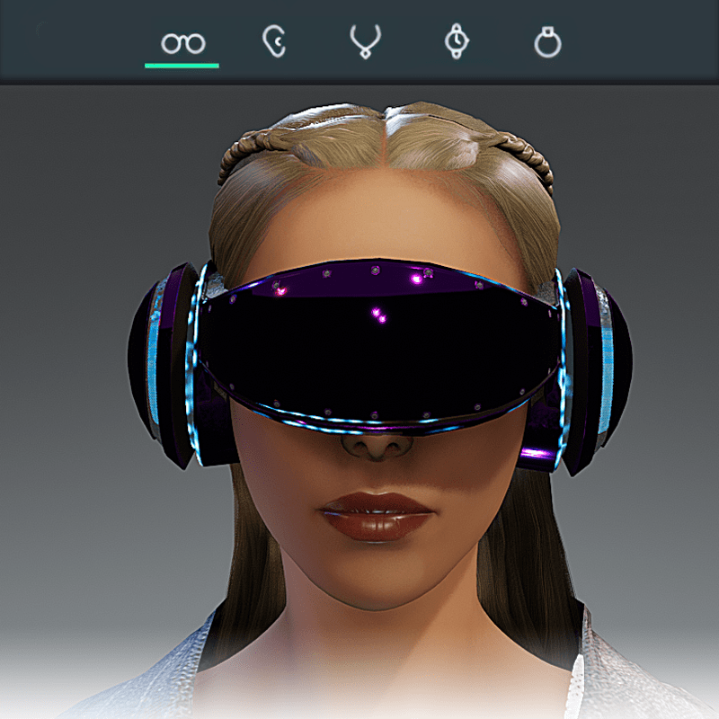Visionary Design for a VR Headset exclusive for Sansar Metaverse. This Vr Glasses don't mess the Hair of your Avatar. Minimal and Elegant Design. Vr Glasses with HeadPhone. Chrome Texture. Animated Light Inside. Unisex. Match with all humanoids avatars. No need adjustments for Default 2.0 Avatar of Sansar.