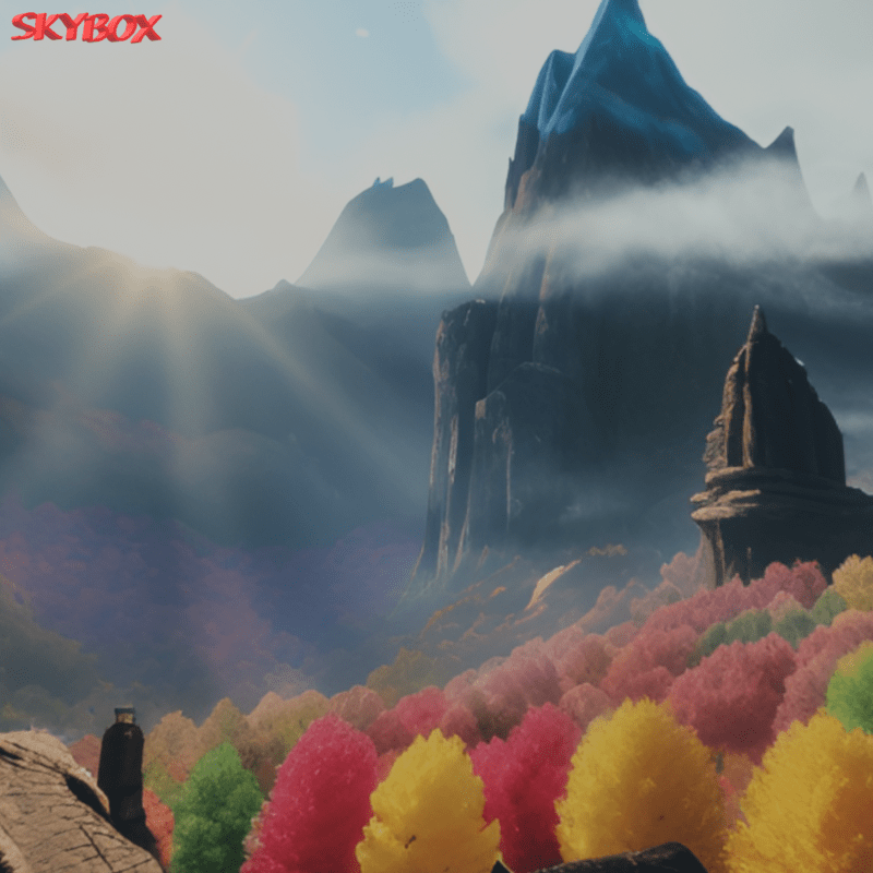 Incredible skybox-Seamless. the landscape is full of autumn trees, sun and a colorful light behind it, in the style of cloudpunk, bryce 3d, mountainous vistas, xbox 360 graphics, shang dynasty, secluded settings, light sky-blue and sky-blue Example skybox here: https://atlas.sansar.com/experiences/acpixl/skybox-sea-by-acpixl