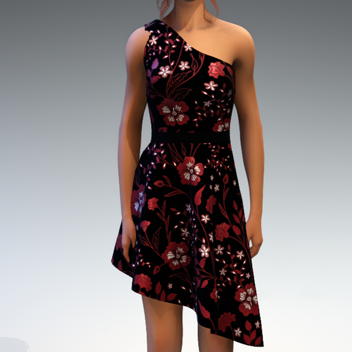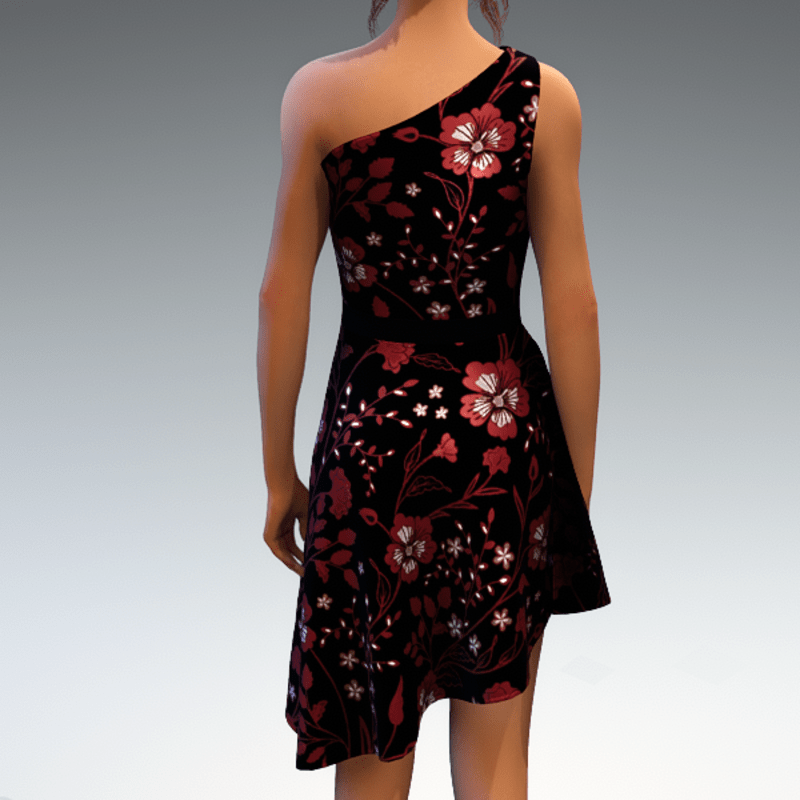 Asymmetric cocktail dress with a shiny floral print. By Sweet Distractions