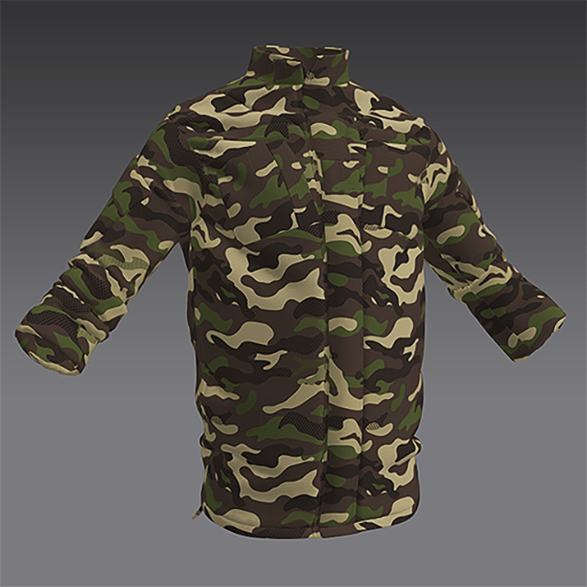 A simple combat jacket in a modern style, with camo pattern. Rolled up sleeves for a more casual look.