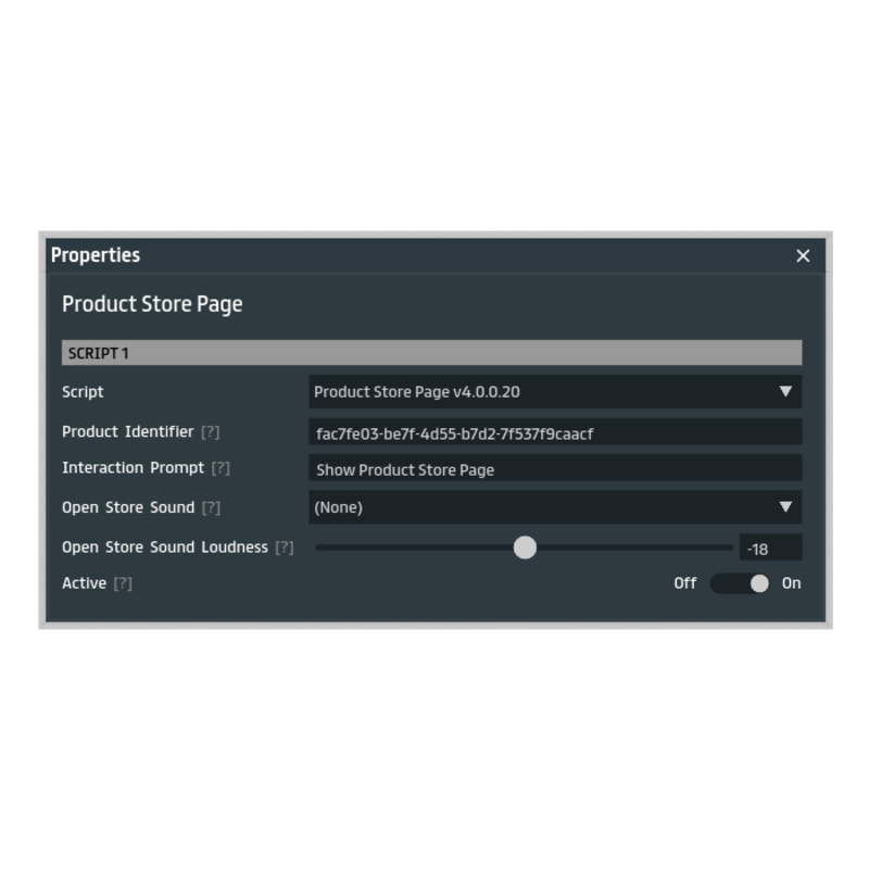 Display a product store listing when clicking an object. _____________________________________________________ ** Instructions ** Drop this script in any object in your experience and change the settings to fit your store listing. ** Settings ** - Product Identifier: the unique identifier of the store listing. This alphanumeric value can be found in the store listing url and is 32 characters long. - Interaction Prompt: text to display when hovering the object. - Open Store Sound: optional sound to play locally when the product store page is opened. - Open Store Sound Loudness: the loudness in decibels of the sound that plays locally when the product store page is opened. - Active: toggles the script on or off. ** Changelog ** v4.0.0.20 (2022-09-03) - Revised code v2.1.0.9 - Added sound settings ** Questions, issues or suggestions? ** Contact @Tron-Sansar