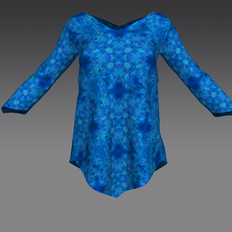 V line tunic in blue fractal design. The design on this shirt is my own fractal art creation. You can see some of my fractal art here: https://atlas.sansar.com/experiences/northernkiara/fractal-consciousness