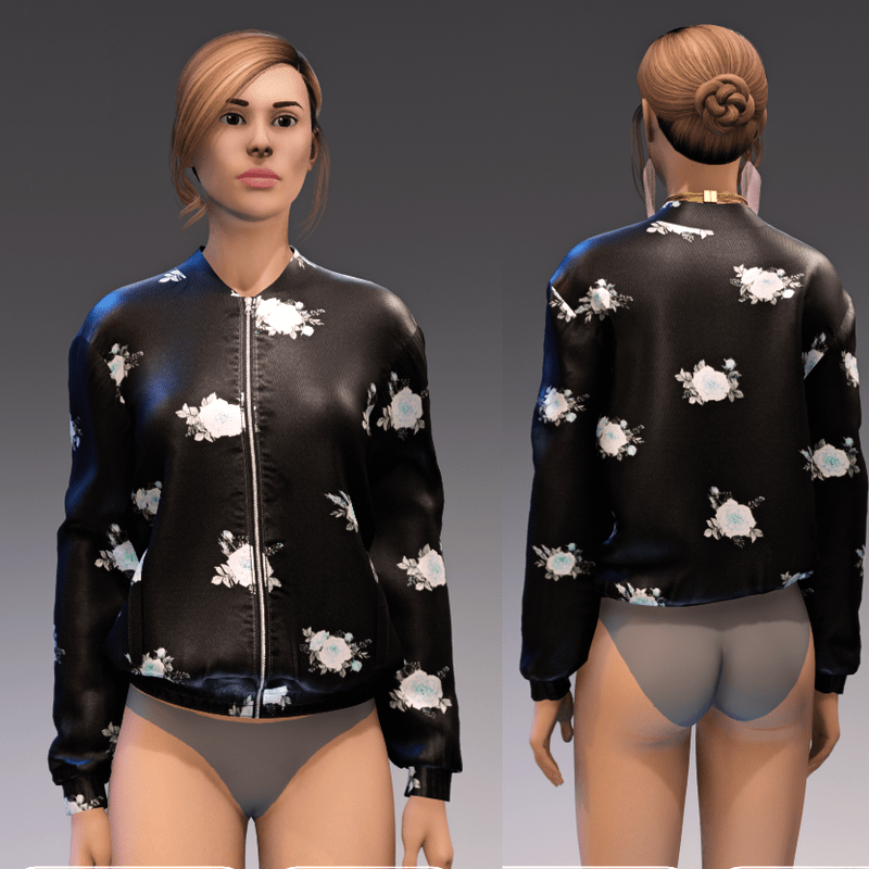A classic style bomber jacket with a modern and glamorous twist in black satin with pink roses pattern. The jacket fasten with a zipper that can be unzipped.