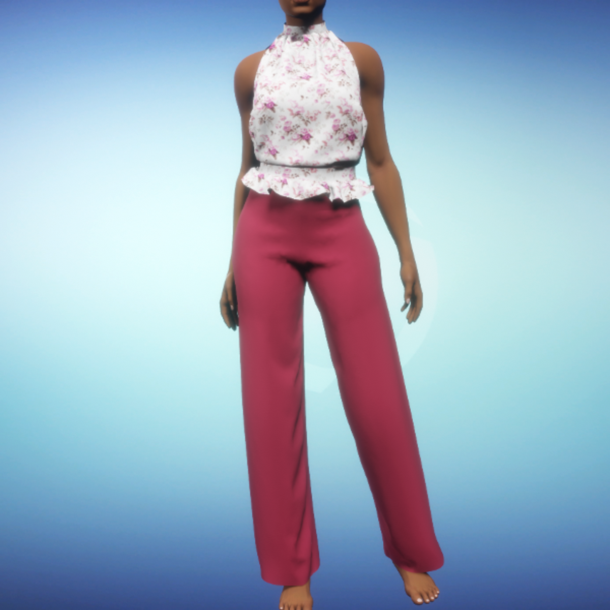 Classy spring 2-piece outfit. The blouse features a flower print with a slight sheen while the wide pants feature a matte polyester material. The blouse and pants cannot be worn separately. By Sweet Distractions