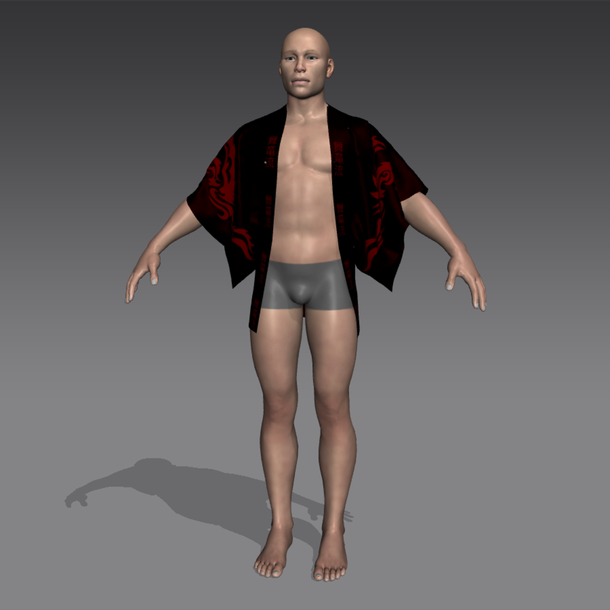A kimono jacket using the traditional pattern. It has dragons on the sleeve and back. It is edged with kanji representing the Dancing Dragon style of kenjutsu. Red on black.