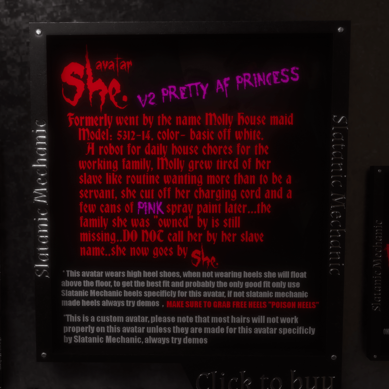 "She." Cyber Punk avatar, this avatar has high heel feet it hovers above the ground when no heels are worn (YOU DO GET A FREE PAIR OF HEELS THAT WILL WORK grab them in world at "the body shop" or here https://store.sansar.com/listings/e094361e-c9a5-4363-97e2-59d9b3fa6f30/poison-heel-slatanic-mechanic, highly recommend only using heels made by slatanic mechanic store (eldiablo claven) for proper fit, Also most hairs will not fit this avatar unless made specificaly for this avatar by slatanic mechanic store (eldiablo claven) always try demos to see if others creators creations will fit