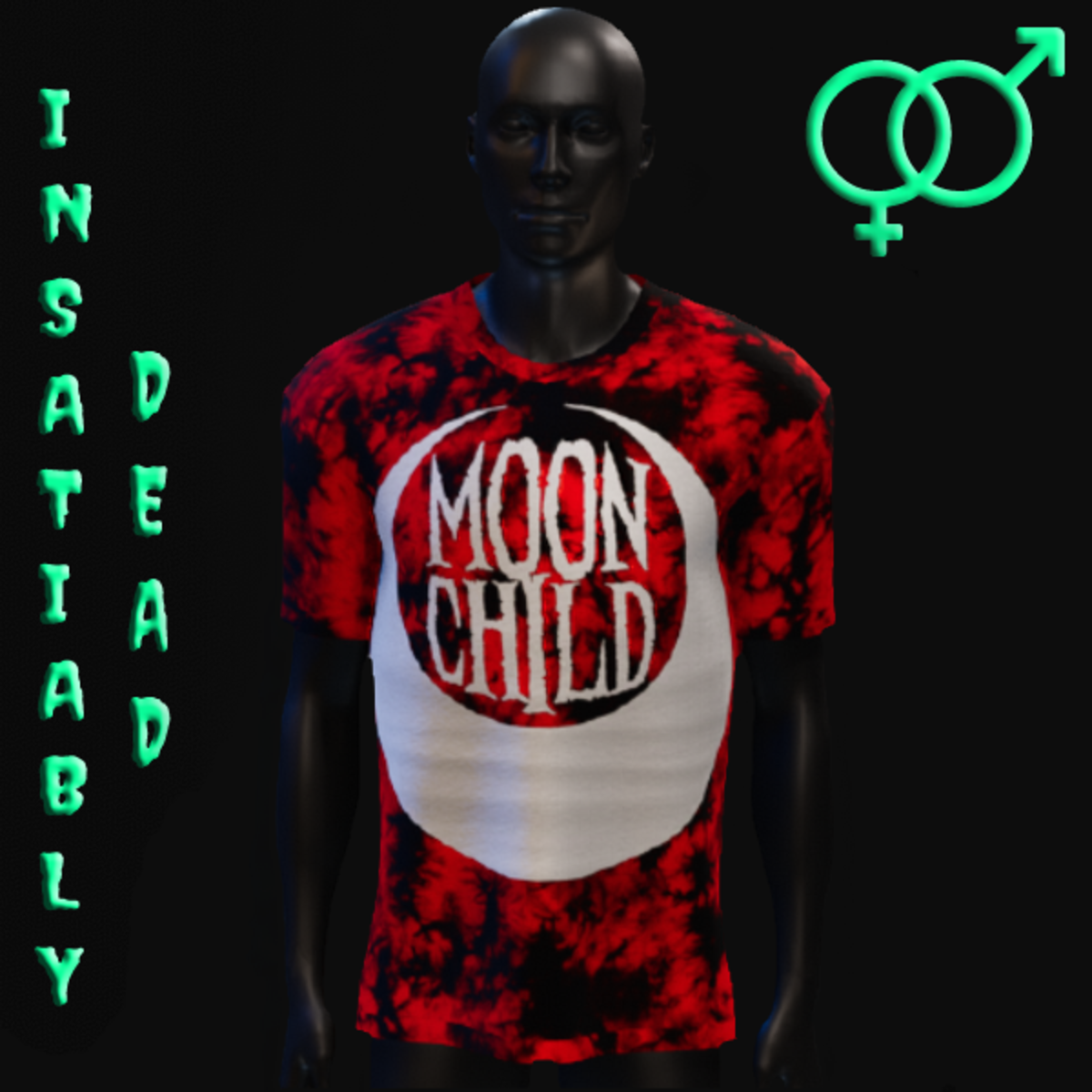 FOR ALL THE GHOULS AND GALS. UNISEX "MOON CHILD" T-SHIRT DARK TIE DYE [BLACK/RED]. CREATED IN MARVELOUS DESIGNER WITH AVATAR 2.0. ADJUSTMENT MAY BE REQUIRED! FITTING INSTRUCTIONS CAN BE FOUND BY GOING TO THE LINK BELOW. https://help.sansar.com/hc/en-us/articles/115005693363-Fitting-Marvelous-Designer-clothing-to-your-avatar PLEASE RATE AFTER BUYING! IF ANY ISSUES OCCUR PLEASE CONTACT TEAGAN BROKKEN FOR ASSISTANCE. THANK YOU! <3 <3 GET INSATIABLY DEAD <3