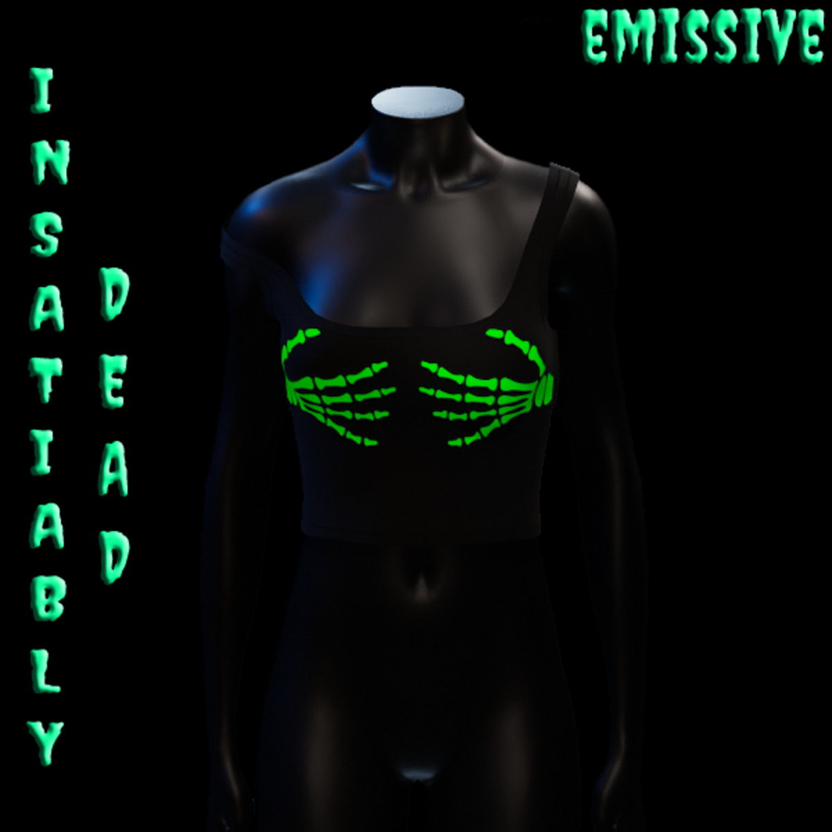 EMISSIVE SKELE HANDS TANK TOP GREEN.[EMISSIVE MEANS I GLOW! PLEASE NOTE THAT ACTUAL COLOR/VIBRANCE WILL VARY BASED ON LIGHTING. FOR THE BEST RESULT WEAR IN AREAS WITH LOW LIGHTING.] CREATED IN MARVELOUS DESIGNER WITH AVATAR 2.0. ADJUSTMENT MAY BE REQUIRED! FITTING INSTRUCTIONS CAN BE FOUND BY GOING TO THE LINK BELOW. https://help.sansar.com/hc/en-us/articles/115005693363-Fitting-Marvelous-Designer-clothing-to-your-avatar PLEASE RATE AFTER BUYING! IF ANY ISSUES OCCUR PLEASE CONTACT TEAGAN BROKKEN FOR ASSISTANCE. THANK YOU! <3 <3 GET INSATIABLY DEAD <3