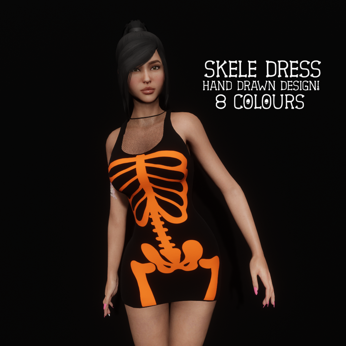 Get your spooky on with this skeleton dress! Perfect for Halloween! High quality textures, hand drawn too! Has beautiful normal map on it as well.