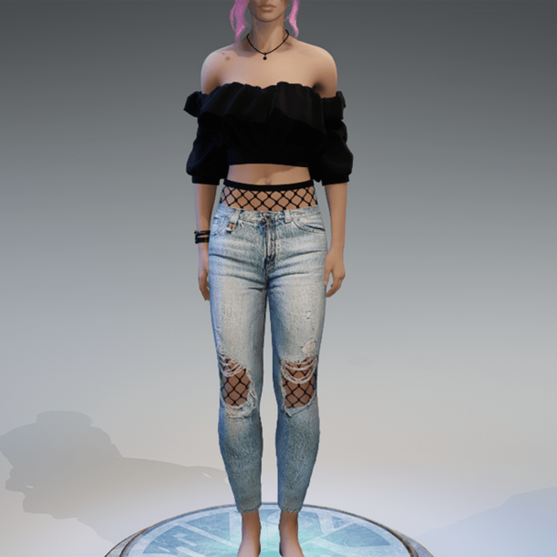 Denim w Fishnet & shoulderfree Top Outfit