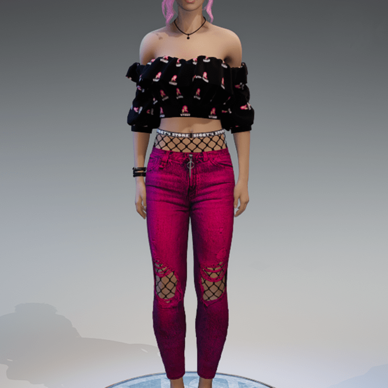 Denim w Fishnet & shoulderfree Black Top Outfit