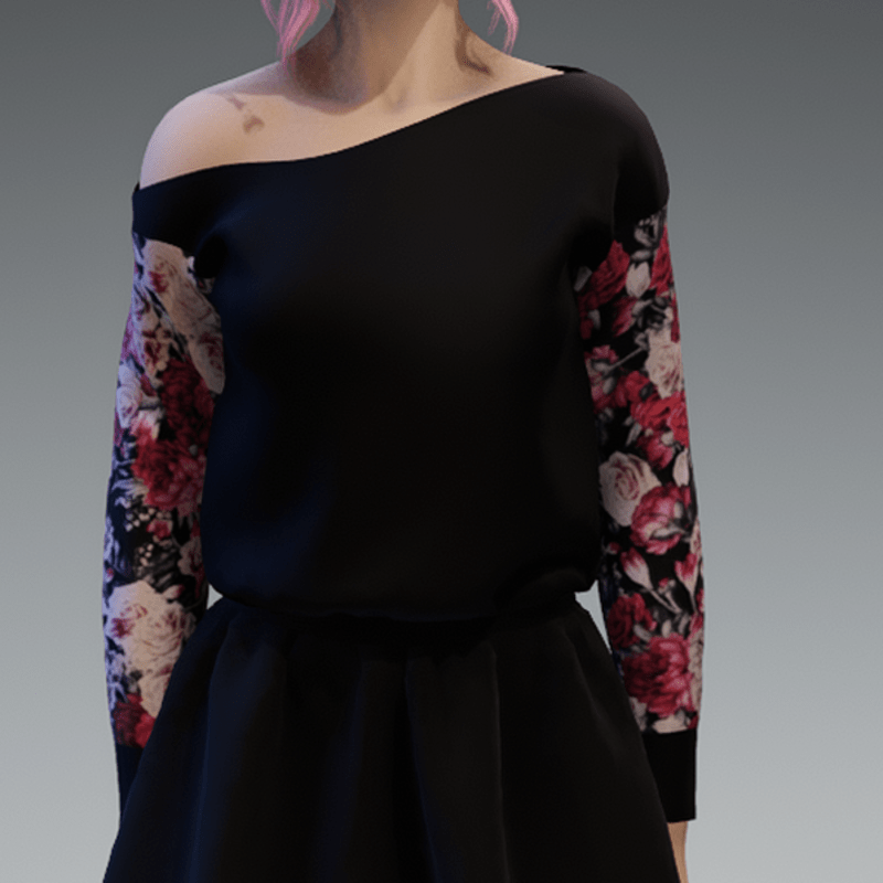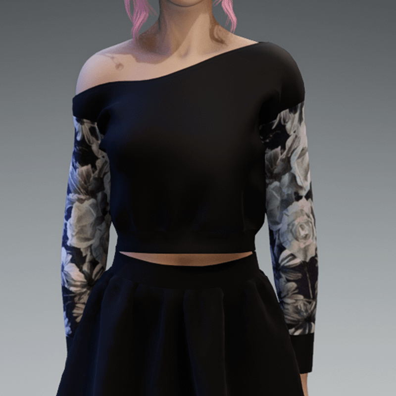 Black Pullover oneshoulderfree shorter with Roses4 Pattern Sleaves