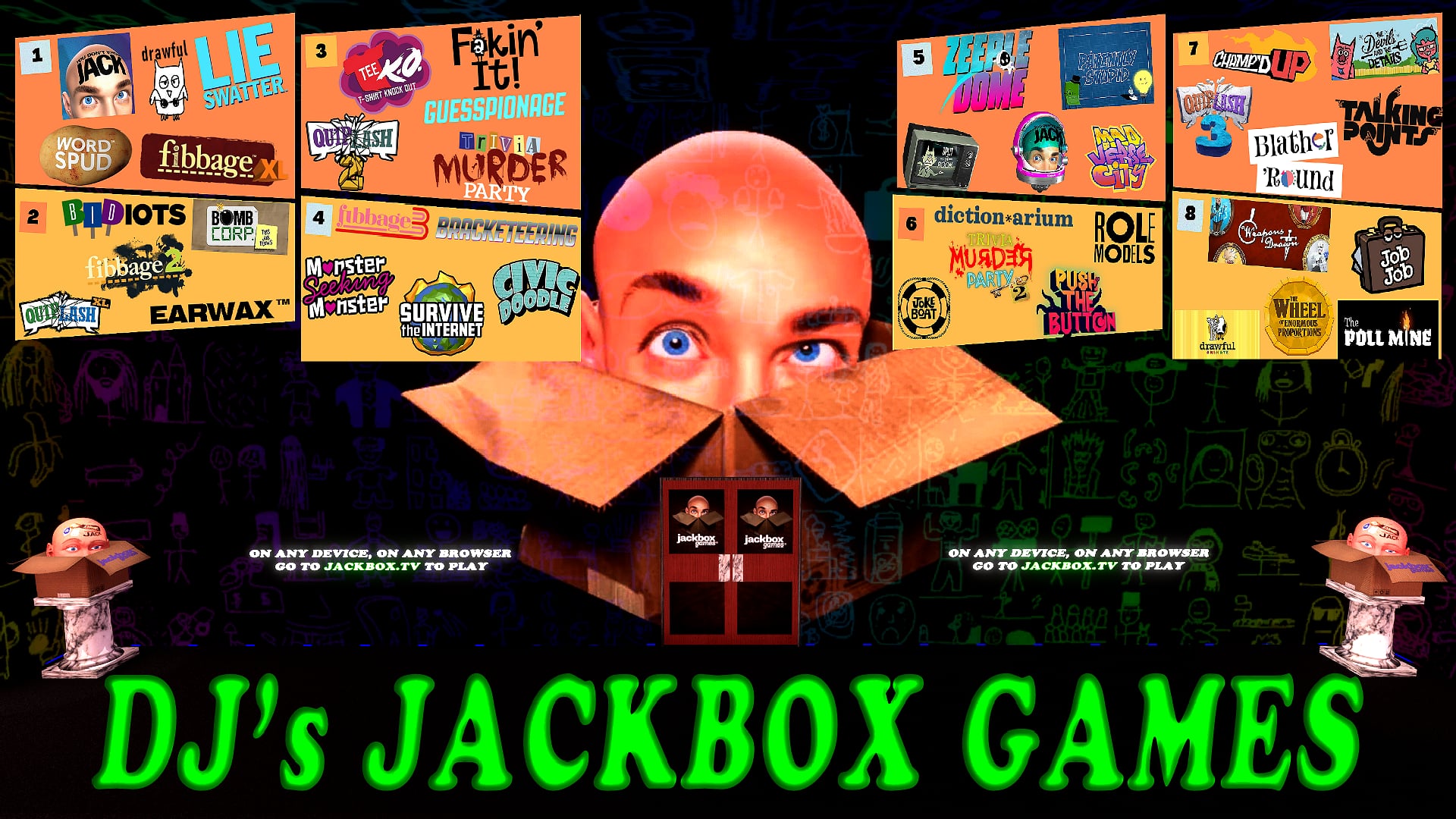 Welcome to DJ's Jackbox Games, Where you grab any device as a remote to the games "LIVE"!!! Feel free to host your own or wait for a spectacular event by DJ himself..