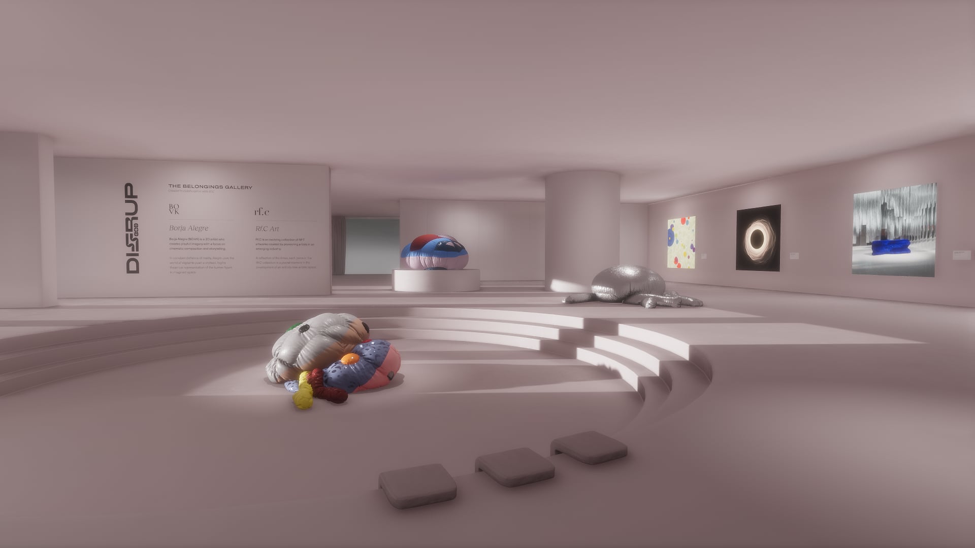 The Belongings Gallery is a three-way collaboration between Dissrup, the artist-centric, digital collectibles platform; BO.VK, the 3D artist; and Rf.C art, a private collection of seminal NFT artworks. Conceived as a space for showcasing Dissrup’s second platform drop, The Belongings Gallery spotlights our latest collaboration with BO.VK. The result is an ambitious installation of giant, digital bean bags, housed in an avant-garde reinterpretation of the traditional white cube gallery space. Dissrup community members and Sansar users can freely explore the space, interacting with the Belongings bean bag installations, as well as the selection of complementary NFT artworks, curated by Rf.C. The Belongings Gallery is the first VR space curated by the Dissrup platform, and a glimpse into the future of virtual art gallery experiences.