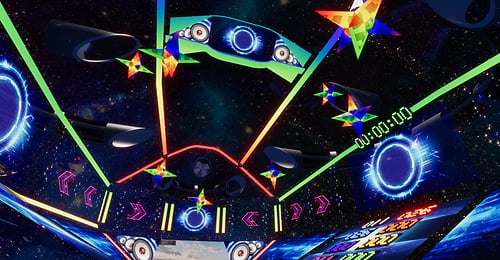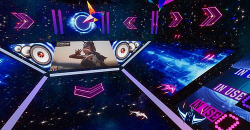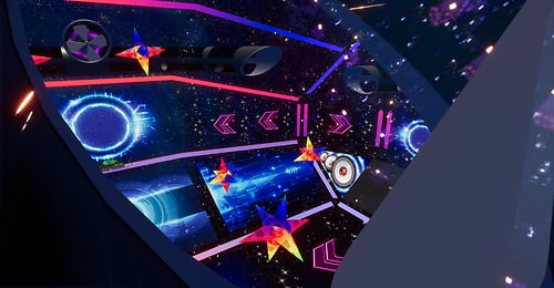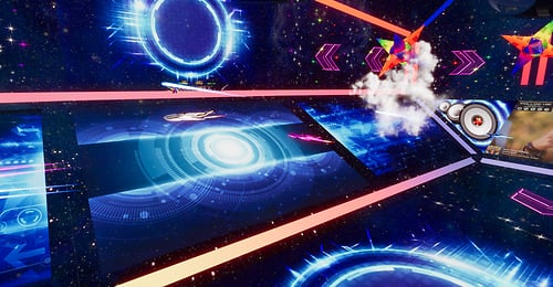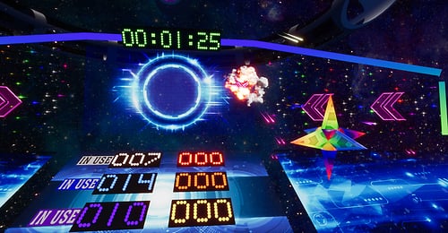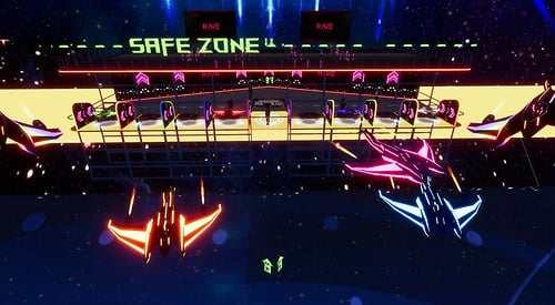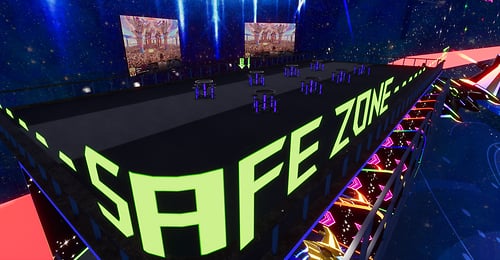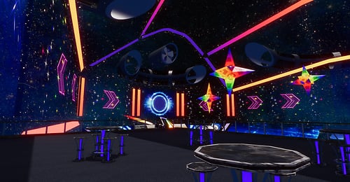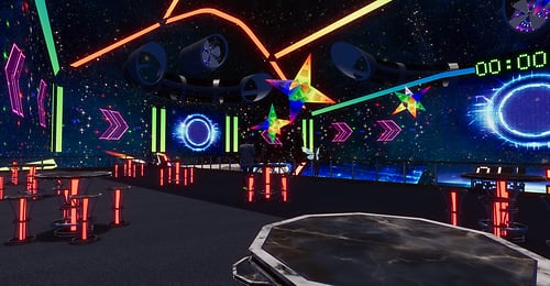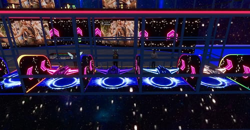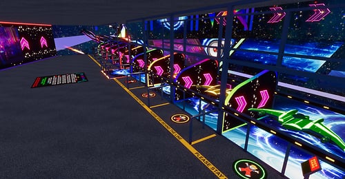 DJ's Battle Gliders. A total of 8 players head into the arena to battle it out. Venture through tunnels and portals and bask in booms and explosion effects that will have you on the edge of your seat. Playable by PC & VR users. Each player has their own score card marked by the same color as their gliders RULES: CHOSE SOMEONE TO HOST, THAT PERSON SHOULD CHOOSE A GLIDER FIRST IF THEY DESIRE TO PLAY OR JUST HOST FROM THE CENTER AREA STEP ONTO MAT TO CLAIM YOUR GLIDER HOST THEN WILL CLICK THE HOST BUTTON WAIT UNTIL EVERYONE HAS CHOSEN A GLIDER AND IS READY TO START THE HOST WILL CLICK THE NEXT LIT BUTTON THE GATES WILL OPEN TO CLICK ON THE GLIDER HOST NOW WILL CLICK START AND THEN ENTER THE GLIDER IF THEY CHOOSE TO JOIN THE ROUND WILL LAST 10 MINUTES HIGHEST SCORE WINS ! OBSTACLES WILL DECRESE YOUR TOTAL SCORE ! ENJOY YOUR GAME *WARNING* WHOLE SCENE COULD BREAK IF PERSONS USE GLIDERS OTHER THAN INTENDED HAVE FUN!!!! DJ