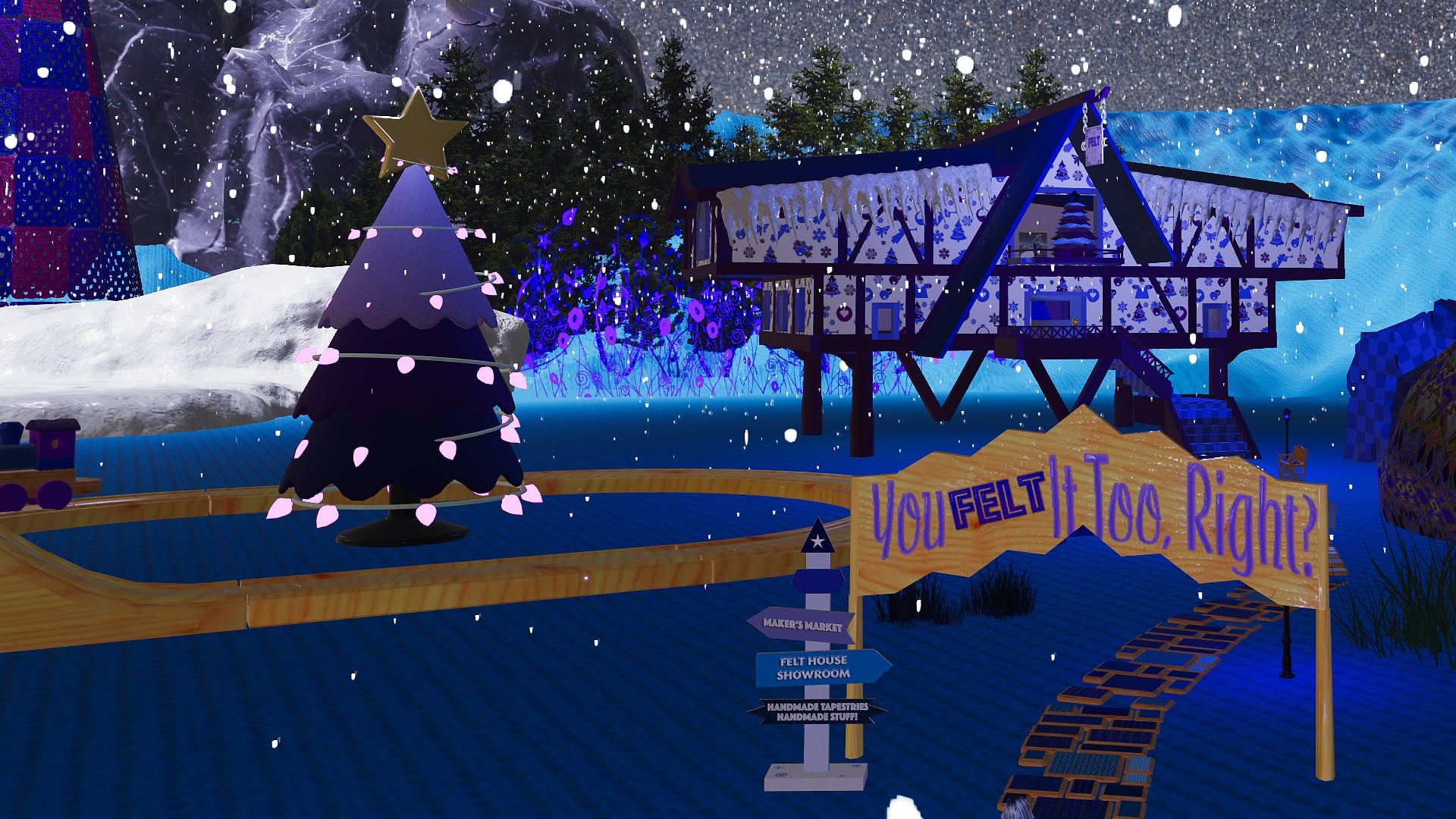 DIY Chrristmas world of felt, knitting, crochet, quilting, and woodcrafts. The theme is HOMEMADE, because that's what Christmas always was to me. Christmas Market, Train and Boat experience. Oh, and a house, too. Celebrating the creative can-do of Sansar