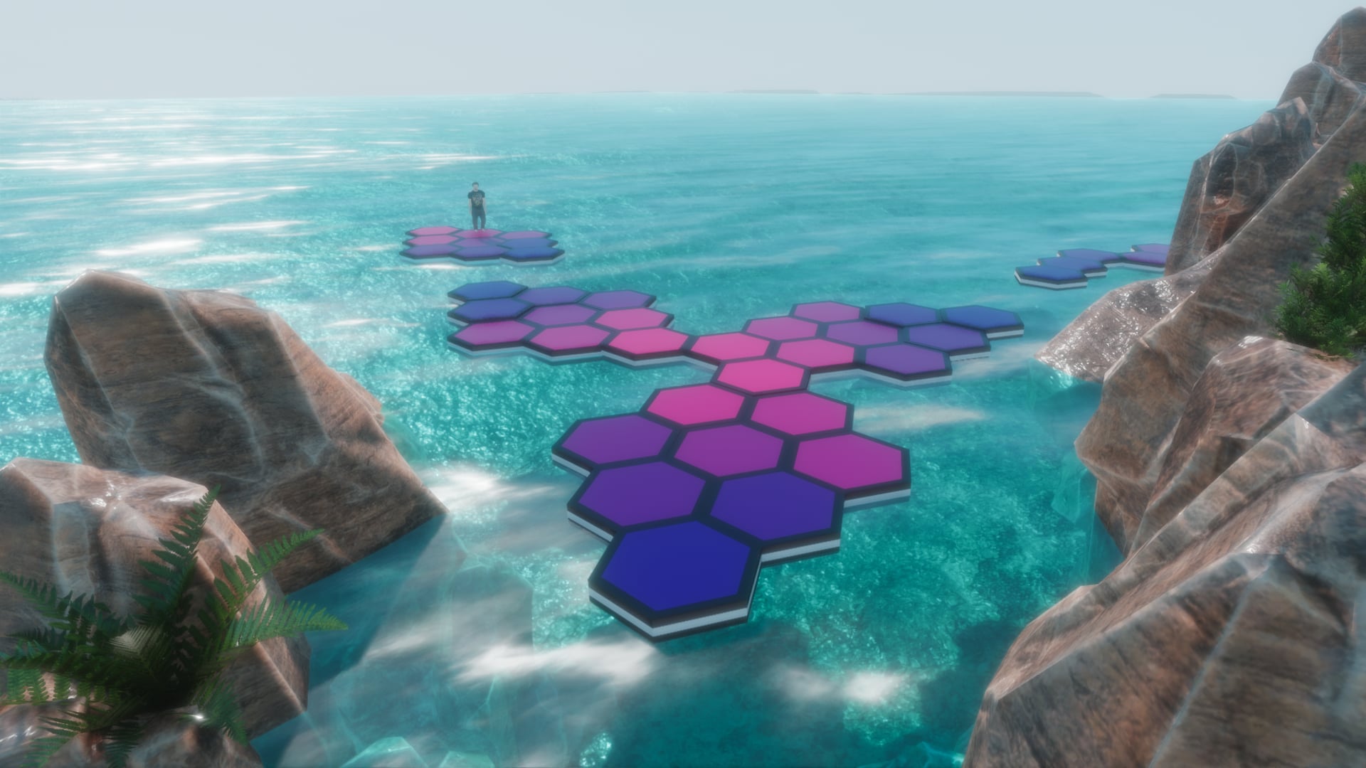 I made this a while ago. The goal was to make hexagon platforms that looks like they float on waves. That was accomplished :) I made a little level to jump from platform to platform. Music, sounds.. I tryed to make it look like game, but I have no further plan and no time ;) so I stopped. Maybe funny for who's interrested to take a look. I was actually surprized that so many animation runs pretty smooth.
