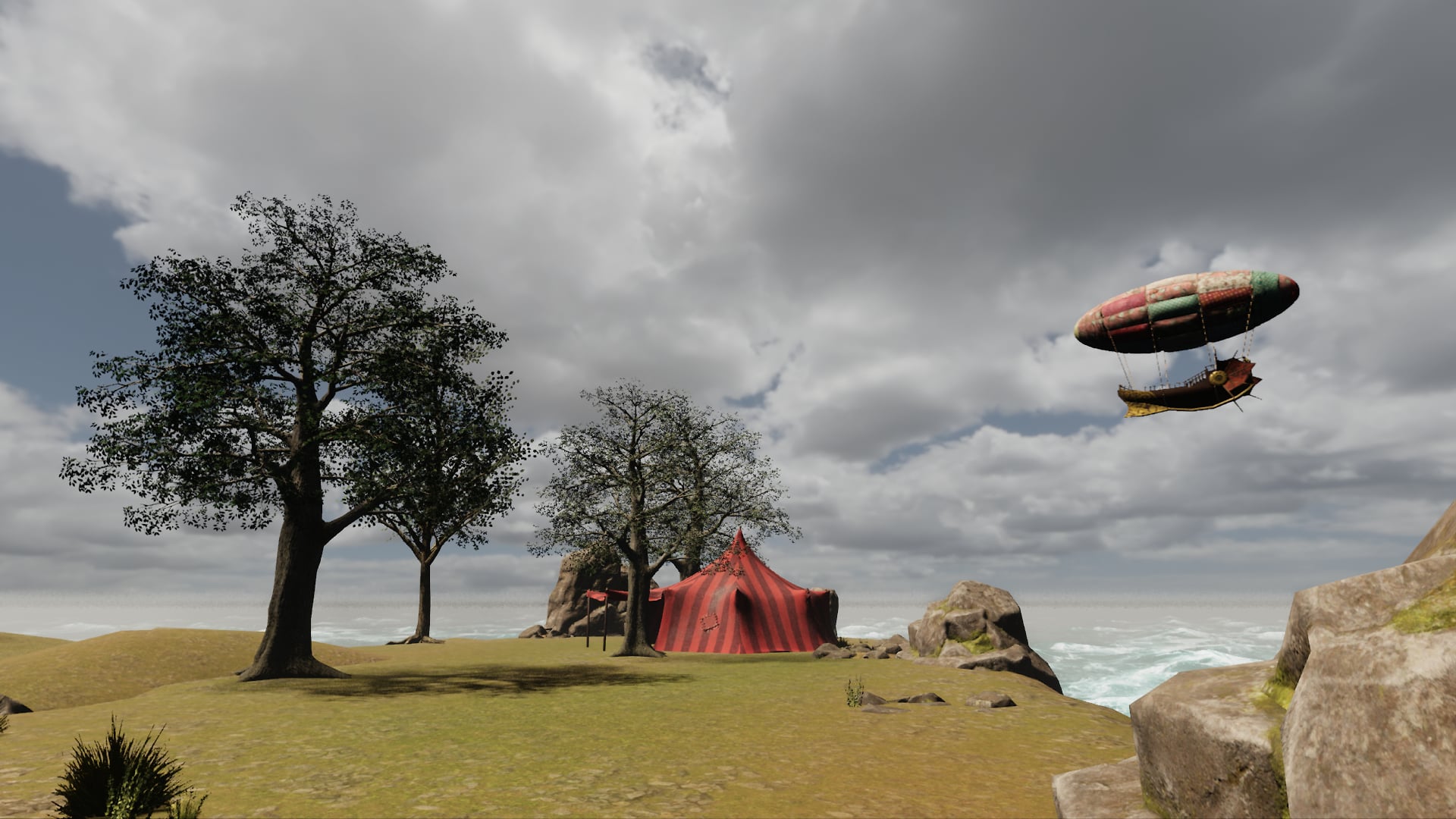 Based on the Highlands Template scene, this is an evolving place for me to get familiar with Sansar's basics. If you see a red book laying on the ground, walk over it to teleport to the ship anchored offshore. There is also a green book that will teleport you to @draxtor's "Meet the Draxies" experience.