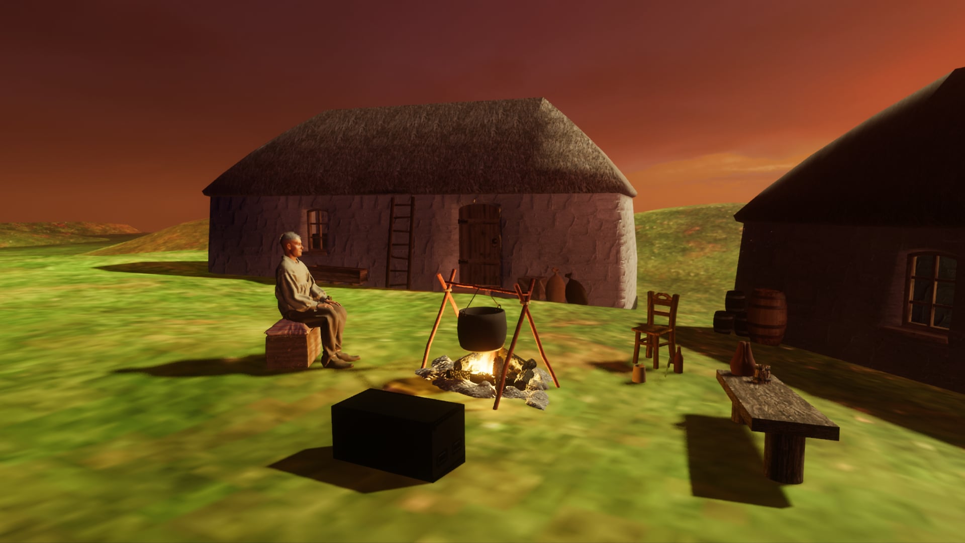 Open green Hillls with a place for a chat around the fire.