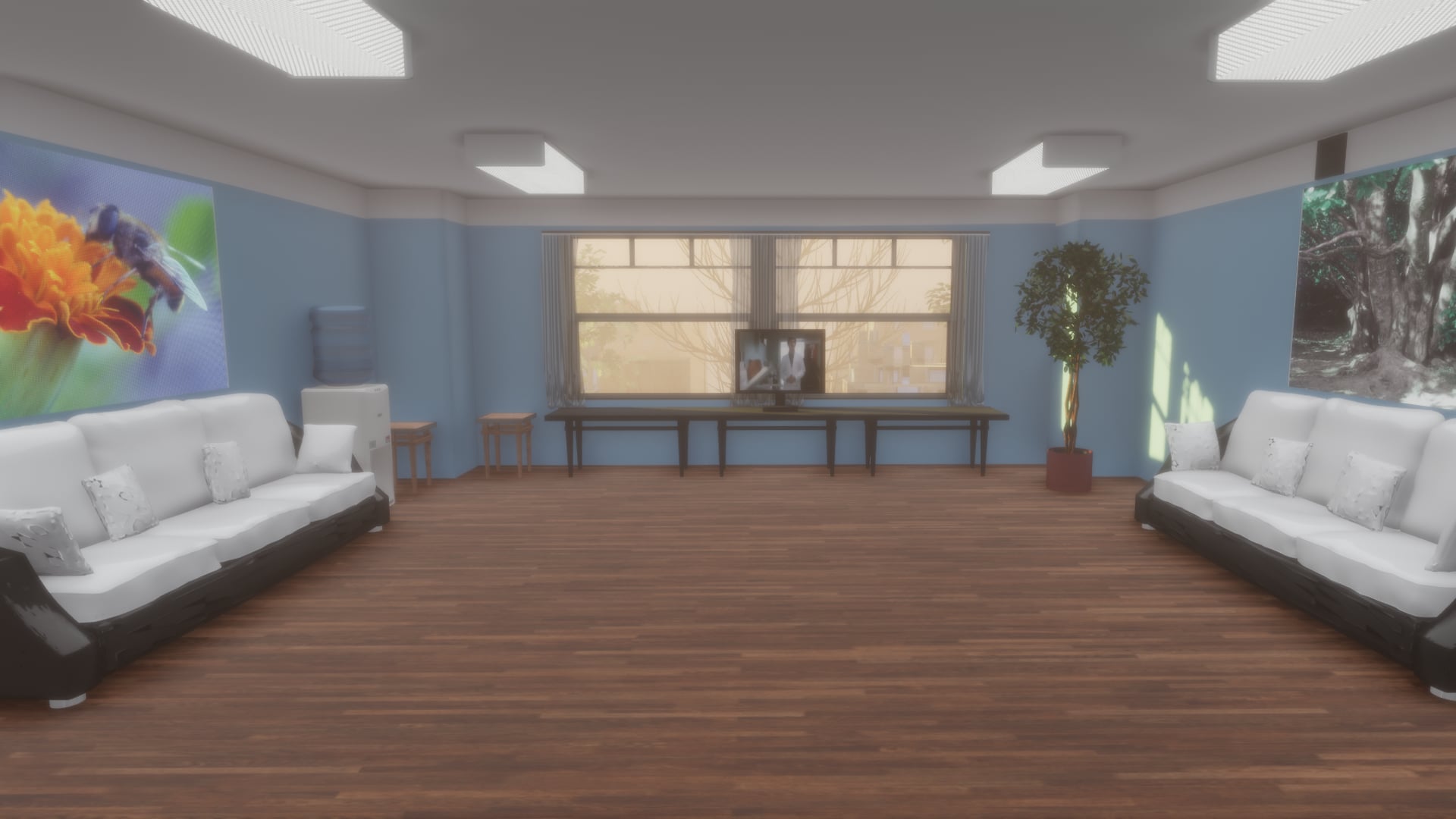 Welcome to the hospital, where you can play doctor and patients or conduct real courses. On the table you can take the following items: a glass of water, a syringe, a thermometer, a nasal spray, eye drops.