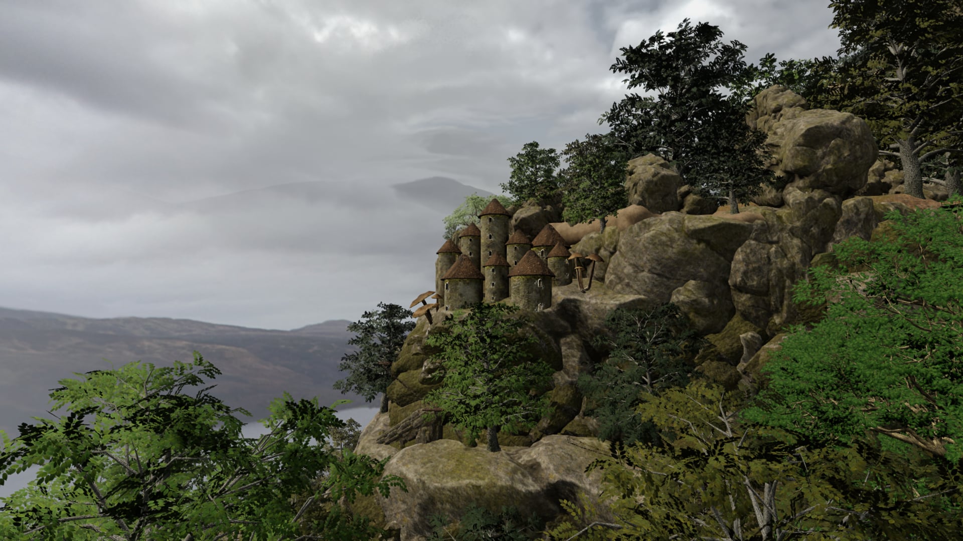 Sequel to Treehouse Overlook. Designed to work on a wider range of computers. Includes a large landing area for events and meetups with a lighthouse and treetop village in the distance. Adjacent to this is the entrance to a dark cavern that winds its way up through the rock of the cliffs and provides access to treetop bridges and majestic lookouts. A short helicopter ride gives a breathtaking view of the greatly expanded cliff system featuring castles embedded in the mountainside face. The whole build is tied together by a series of teleporters that allow quick access to the most interesting parts of the park. Walk up to one of the framed paintings and activate to teleport to the place depicted. opened to public: January 15, 2019 experience last updated: January 30, 2019 tags: trees, forest, lighthouse, nature, park, cave, liferain