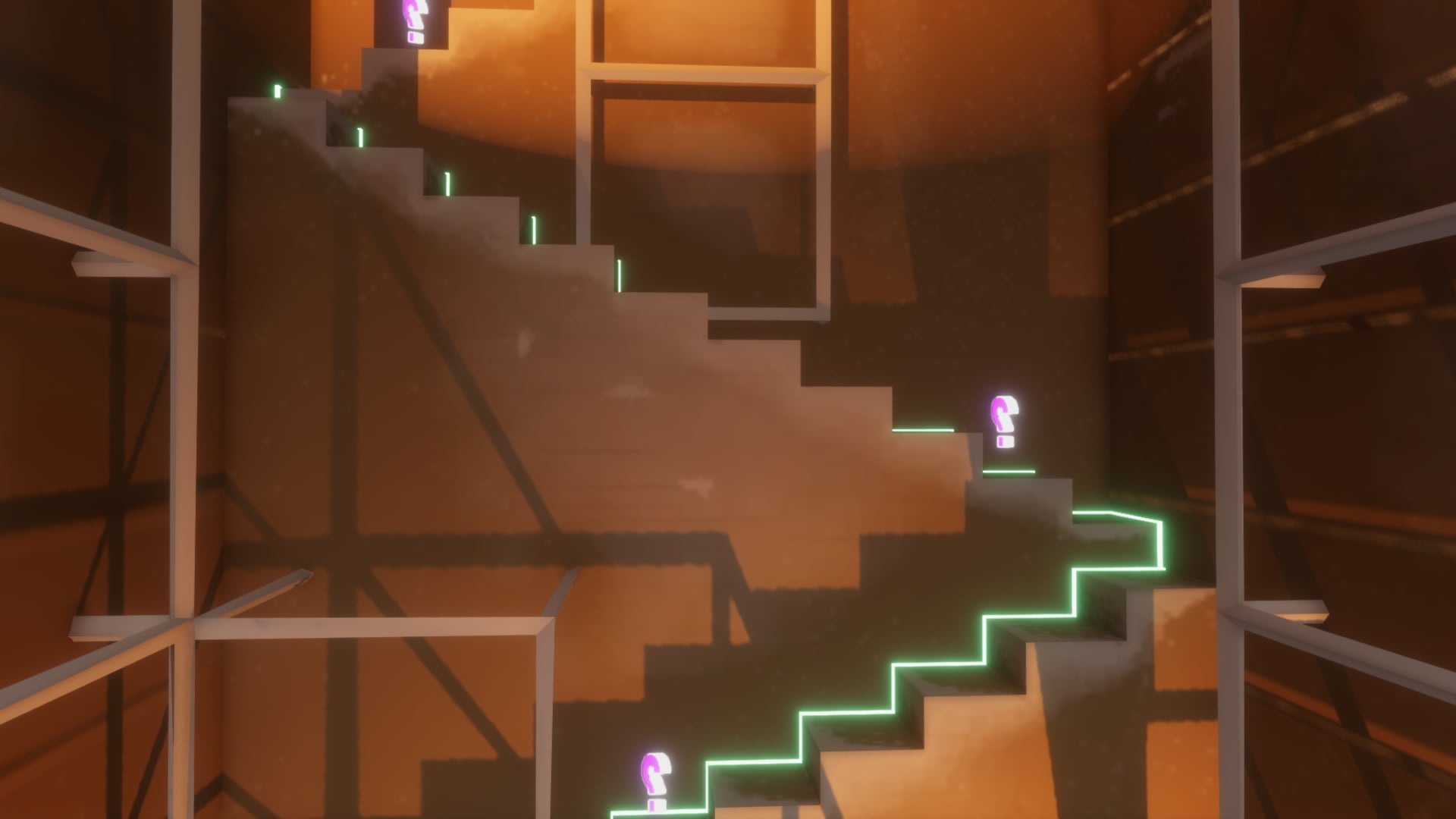 While traversing up the stairs, use the pink board to monitor your location, Question marks are teleports and the black lines on the board represent where those question marks will teleport you to. Have Fun. Yeeey...