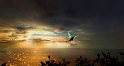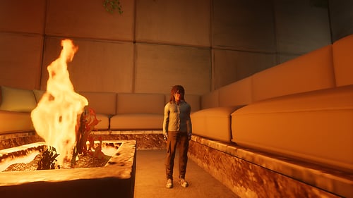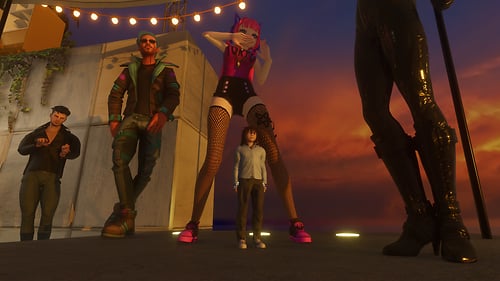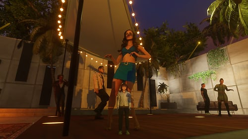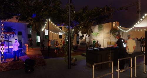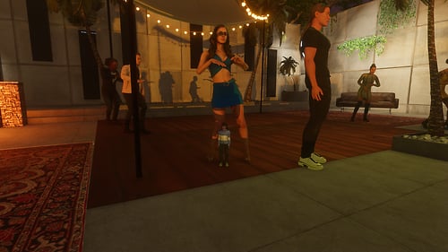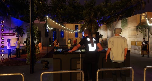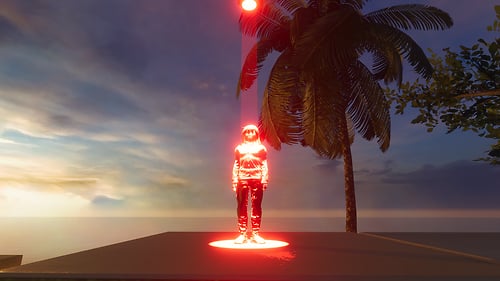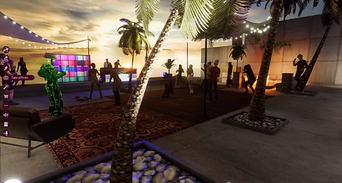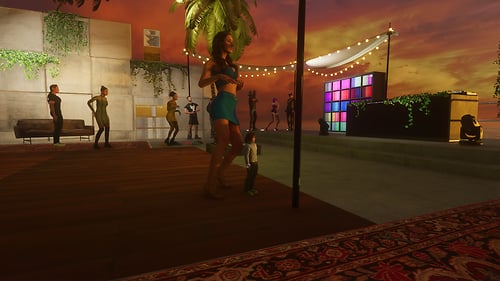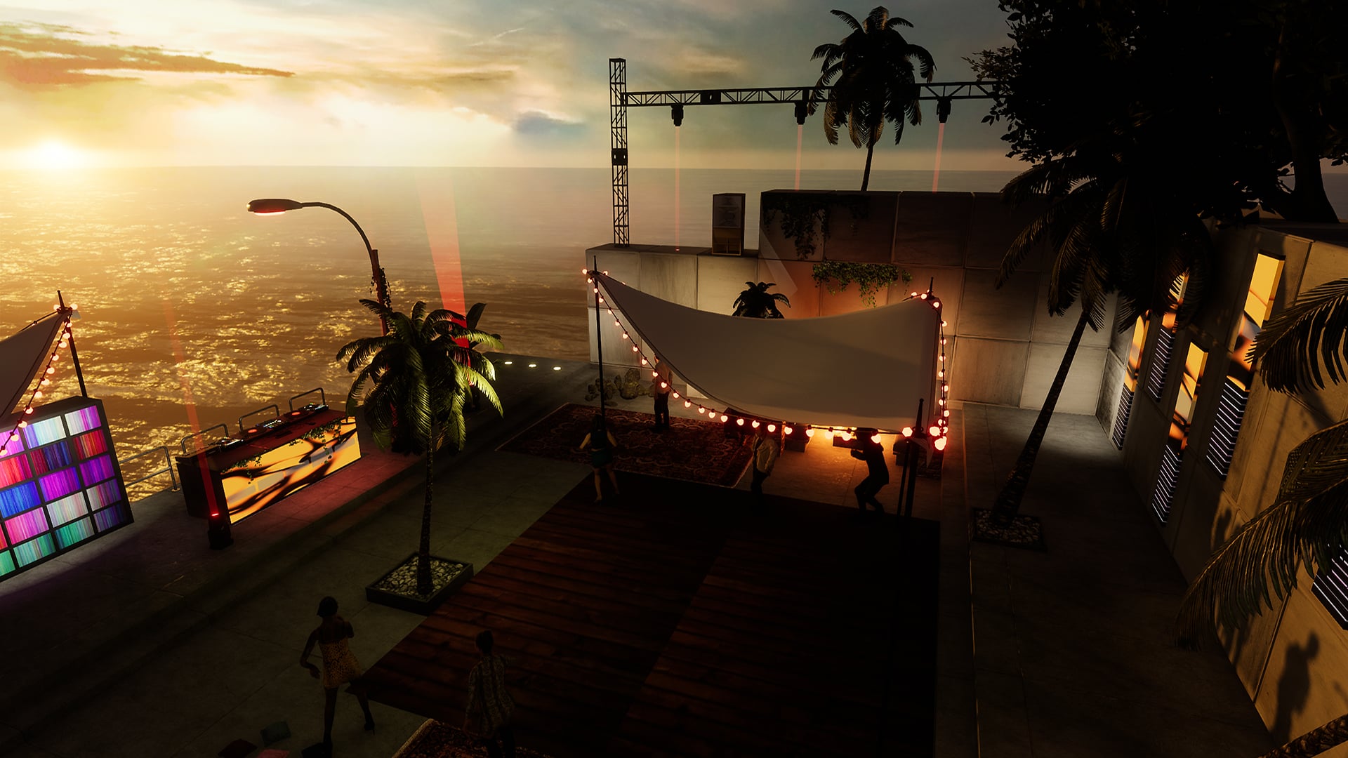 VJ's space for ambient dj sets. I love lighting and light effects, and electronic dance music. I created this space for more ambient music and softer lighting. It's an emotional setting with a beautiful sunset by the sea.